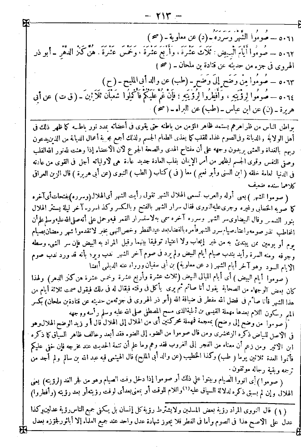 (1) قال النووي: المراد رؤية بعض المسلمين ولا يشترط رؤية كل إنسان بل يكفي جميع الناس رؤية عدلين وكذا عدل على الأصح هذا في الصوم وأما في الفطر فلا يجوز شهادة عدل واحد عند جميع العلماء إلا أبا ثور فجوزه بعدل