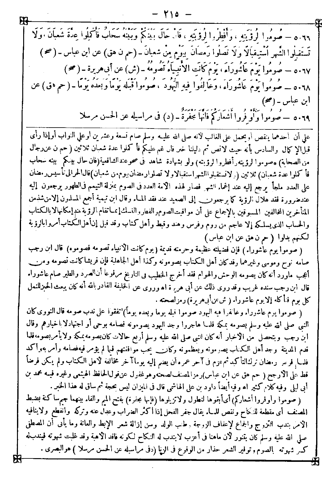 5066 - (صوموا لرؤيته وأفطروا لرؤيته) ولو بشهادة شاهد في صحو عند الشافعية (فإن حال بينكم وبينه سحاب فأكملوا عدة شعبان) ثلاثين (ولا تستقبلوا الشهر استقبالا ولا تصلوا رمضان بيوم من شعبان) قال الحرالي: تأسيس رمضان على العدد ملجأ يرجع إليه عند إغماء الشهر فصار لهذه الأمة العدد في الصوم بمنزلة التيمم في الطهور يرجعون إليه عند ضرورة فقد هلال الرؤية كما يرجعون إلى الصعيد عند فقد الماء وقال ابن تيمية: أجمع المسلمون إلا من شذ من المتأخرين المخالفين المسبوقين بالإجماع على أن مواقيت الصوم والفطر والنسك إنما تقام الرؤية عند إمكانها لا بالكتاب والحساب الذي يسلكه الأعاجم من روم وفرس وهند وقبط وأهل كتاب وقد قيل إن أهل الكتاب أمروا بالرؤية لكنهم بدلوا