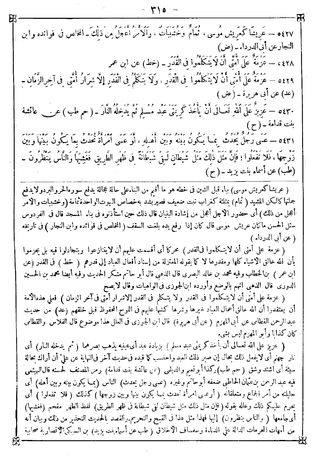 5429 - (عزمة على أمتي أن لا يتكلموا في القدر ولا يتكلم في القدر إلا شرار أمتي في آخر الزمان) فعلى هذه الأمة أن يعتقدوا أن الله خالق أعمال العباد خيرها وشرها كتبها عليهم في اللوح المحفوظ قبل خلقهم