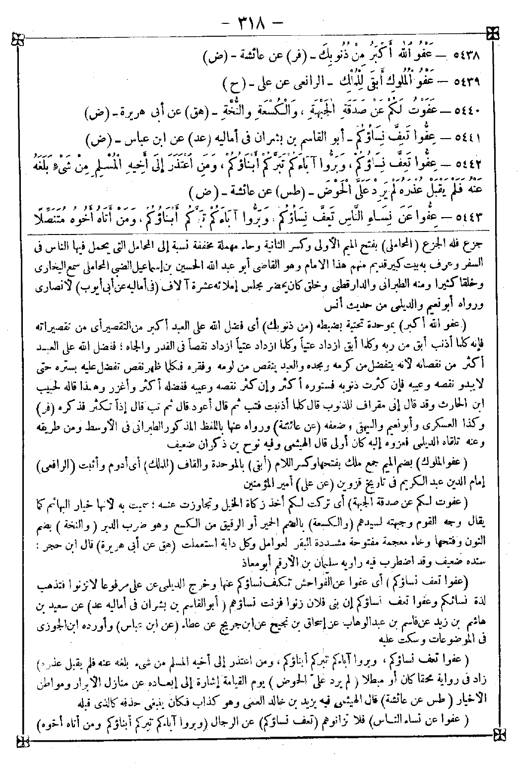 5443 - (عفوا عن نساء الناس) فلا تزانوهم (تعف نساؤكم) عن الرجال (وبروا آباءكم تبركم أبناؤكم ومن أتاه أخوه) -[319]- أي في الإسلام وإن لم يكن من النسب (متنصلا) أي منتفيا من ذنب معتذرا (فليقبل ذلك منه محقا كان أو مبطلا) في تنصله (فإن لم يفعل) أي لم يقبل (لم يرد علي الحوض) يوم يرده المؤمنون في الموقف الأعظم