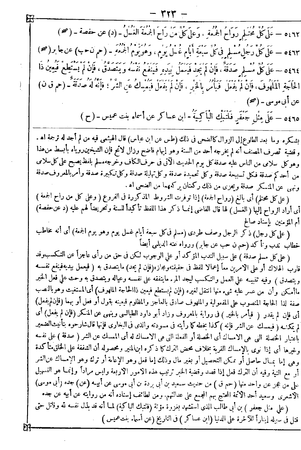 5462 - (على كل محتلم) أي بالغ (رواح الجمعة) إذا توفرت الشروط المذكورة في الفروع (وعلى كل من راح الجمعة) أي أراد الرواح إليها (الغسل) لها قال القاضي: إنما ذكر هذا اللفظ تأكيدا للسنة وتحريضا لهم عليه