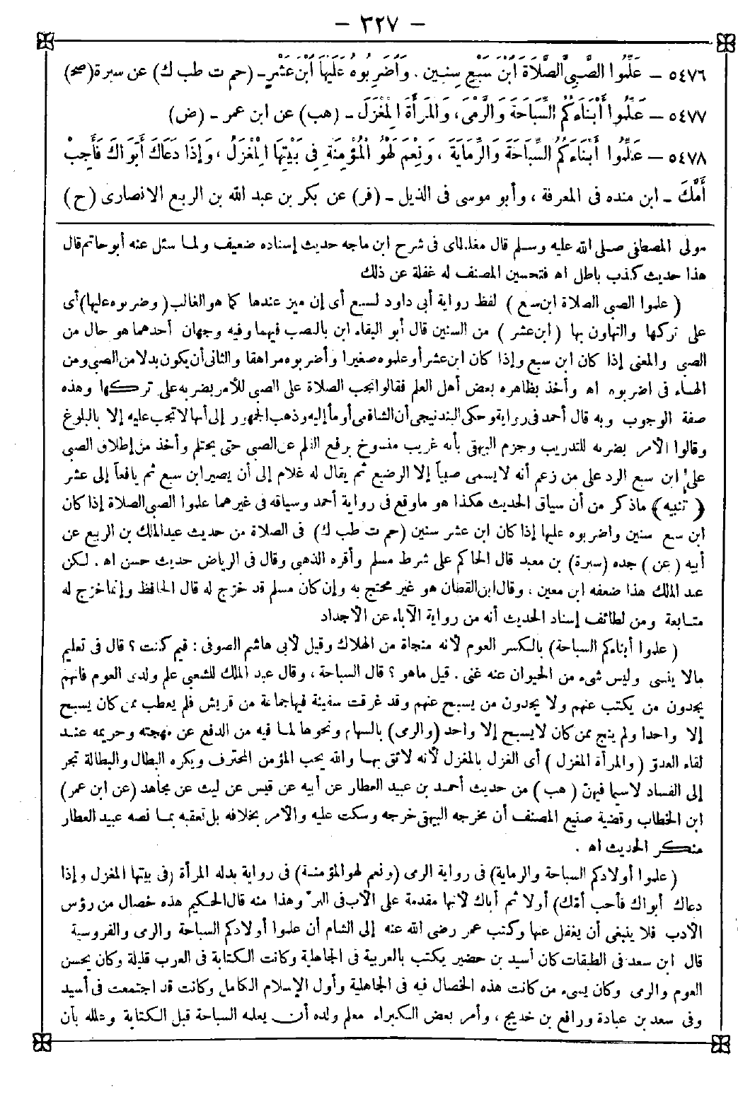 5477 - (علموا أبناءكم السباحة) بالكسر العوم لأنه منجاة من الهلاك وقيل لأبي هاشم الصوفي: فيم كنت؟ قال: في تعليم ما لا ينسى وليس شيء من الحيوان عنه غنى. قيل: ما هو؟ قال: السباحة وقال عبد الملك للشعبي: علم ولدي العوم فإنهم يجدون من يكتب عنهم ولا يجدون من يسبح عنهم وقد غرقت سفينة فيها جماعة من قريش فلم يعطب ممن كان يسبح إلا واحدا ولم ينج ممن كان لا يسبح إلا واحدا (والرمي) بالسهام ونحوها لما فيه من الدفع عن مهجته وحريمه عند لقاء العدو (والمرأة المغزل) أي الغزل بالمغزل لأنه لائق بها والله يحب المؤمن المحترف ويكره البطال والبطالة تجر إلى الفساد لا سيما فيهن
