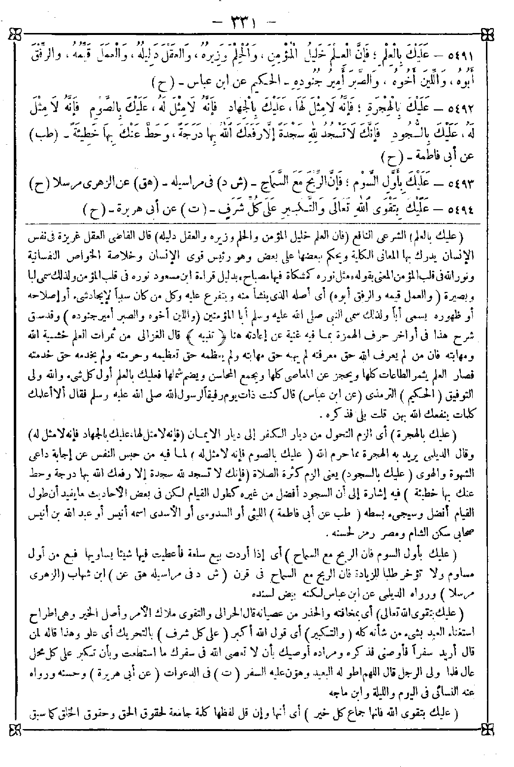 -[331]- 5491 - (عليك بالعلم) الشرعي النافع (فإن العلم خليل المؤمن والحلم وزيره والعقل دليله) قال القاضي: العقل غريزة في نفس الإنسان يدرك بها المعاني الكلية ويحكم ببعضها على بعض وهو رئيس قوى الإنسان وخلاصة الخواص النفسانية ونور الله في قلب المؤمن المعني بقوله {مثل نوره كمشكاة فيها مصباح} بدليل قراءة ابن مسعود نوره في قلب المؤمن ولذلك سمي لبا وبصيرة (والعمل قيمه والرفق أبوه) أي أصله الذي ينشأ منه ويتفرع عليه وكل من كان سببا لإيجاد شيء أو إصلاحه أو ظهوره يسمى أبا ولذلك سمي النبي صلى الله عليه وسلم أبا المؤمنين (واللين أخوه والصبر أمير جنوده) وقد سبق شرح هذا في أواخر حرف الهمزة بما فيه غنية عن إعادته هنا <تنبيه> قال الغزالي: من ثمرات العلم خشية الله ومهابته فإن من لم يعرف الله حق معرفته لم يهبه حق مهابته ولم يعظمه حق تعظيمه وحرمته ولم يخدمه حق خدمته فصار العلم يثمر الطاعات كلها ويحجز عن المعاصي كلها ويجمع المحاسن ويضم شملها فعليك بالعلم أول كل شيء والله ولي التوفيق