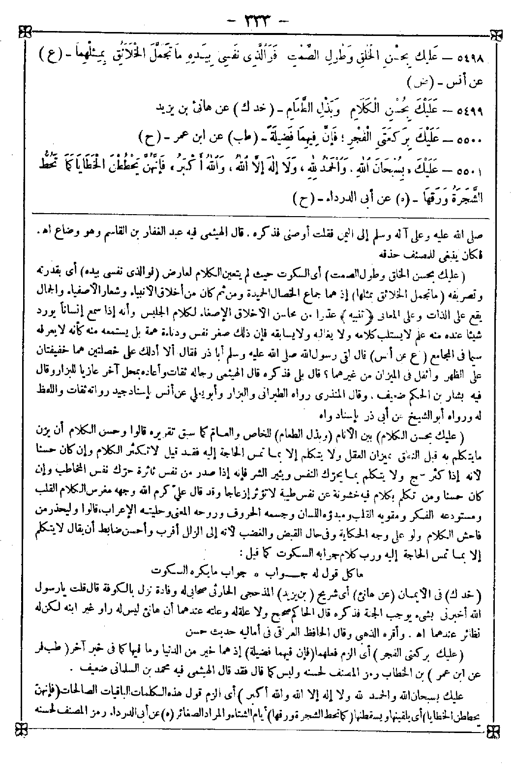 5498 - (عليك بحسن الخلق وطول الصمت) أي السكوت حيث لم يتعين الكلام لعارض (فوالذي نفسي بيده) أي بقدرته وتصريفه (ما تجمل الخلائق بمثلهما) إذ هما جماع الخصال الحميدة ومن ثم كان من أخلاق الأنبياء وشعار الأصفياء والجمال يقع على الذات وعلى المعاني