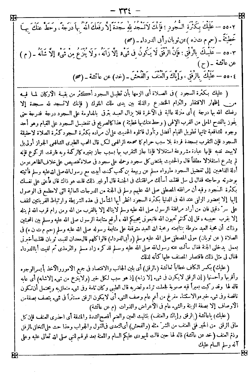 -[334]- 5502 - (عليك بكثرة السجود) في الصلاة أي الزمها بأن تطيل السجود أكثر من بقية الأركان لما فيه من إظهار الافتقار والتزام الخضوع والذلة بين يدي ملك الملوك (فإنك لا تسجد لله سجدة إلا رفعك الله بها درجة) أي منزلة عالية في الآخرة فلا يزال العبد يترقى بالمداومة على السجود درجة فدرجة حتى يفوز بالقدح المعلى من القرب الإلهي (وحط عنك بها خطيئة) هذا كالصريح في تفضيل السجود على القيام وهو أحد وجوه للشافعية ثانيها تطويل القيام أفضل وتأول قائلوه الحديث على أن مراده بكثرة السجود كثرة الصلاة لا حقيقة السجود فإن التقرب بسجدة فردة بلا سبب حرام كما صححه الرافعي لكن قال المحب الطبري الشافعي: الجواز أولى بل لا يبعد ندبه فإنها عبادة مشروعة استقلالا فإذا جاز التقرب بها بسبب جاز بغيره كالركعة وبه فارقت الركوع فإنه لم يشرع استقلالا مطلقا قال: والحديث يقتضي كل سجود وحمله على سجود في صلاة تخصيص على خلاف الظاهر ومن أدلة الذاهبين إلى تفضيل السجود ما رواه مسلم عن ربيعة بن كعب كنت أبيت مع رسول الله صلى الله عليه وسلم فأتيته بوضوئه وحاجته فقال لي: سل فقلت: أسألك مرافقتك في الجنة قال: أو غير ذلك قلت: هو ذلك قلت: فأعني على نفسك بكثرة السجود وفيه أن مرافقة المصطفى صلى الله عليه وسلم في الجنة من الدرجات العالية التي لا مطمع في الوصول إليها إلا بحضور الزلفى عند الله في الدنيا بكثرة السجود انظر أيها المتأمل في هذه الشريطة وارتباط القرينتين لتقف على سر دقيق فإن من أراد مرافقة الرسول صلى الله عليه وسلم لا يناله إلا بالقرب من الله ومن رام قرب الله لم ينله إلا بقرب حبيبه {قل إن كنتم تحبون الله فاتبعوني يحببكم الله} أوقع متابعة الرسول صلى الله عليه وسلم بين المحبتين وذلك أن محبة العبد منوطة بمتابعته ومحبة الله العبد متوقفة على متابعة رسوله صلى الله عليه وسلم