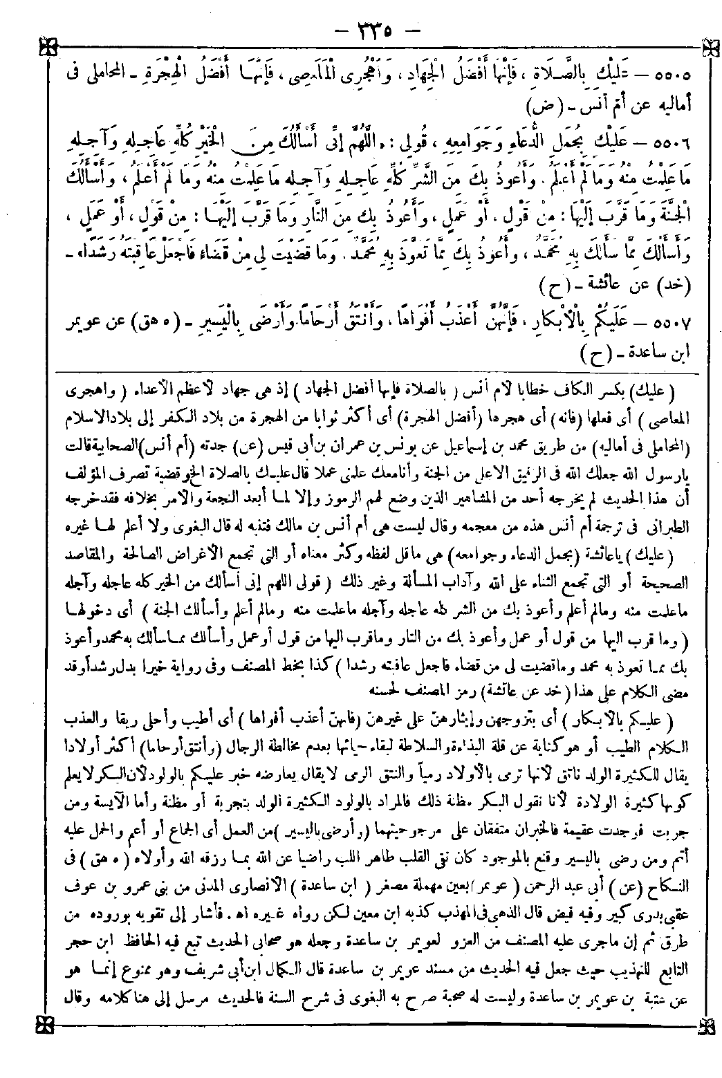 -[335]- 5505 - (عليك) بكسر الكاف خطابا لأم أنس (بالصلاة فإنها أفضل الجهاد) إذ هي جهاد لأعظم الأعداء (واهجري المعاصي) أي فعلها (فإنه) أي هجرها (أفضل الهجرة) أي أكثر ثوابا من الهجرة من بلاد الكفر إلى بلاد الإسلام
