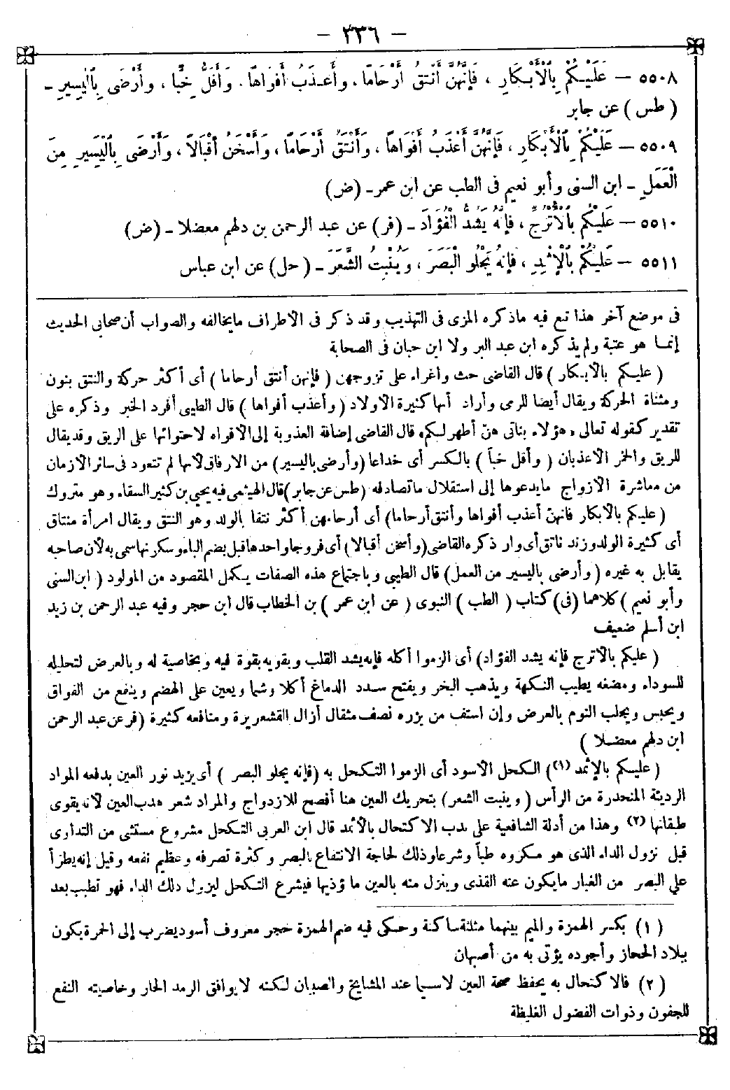 5511 - (عليكم بالإثمد (1)) الكحل الأسود أي الزموا التكحل به (فإنه يجلو البصر) أي يزيد نور العين بدفعه المواد الرديئة المنحدرة من الرأس (وينبت الشعر) بتحريك العين هنا أفصح للازدواج والمراد شعر هدب العين لأنه يقوي طبقاتها (2) وهذا من أدلة الشافعية على ندب الاكتحال بالأثمد قال ابن العربي: التكحل مشروع مستثنى من التداوي قبل نزول الداء الذي هو مكروه طبا وشرعا وذلك لحاجة الانتفاع بالبصر وكثرة تصرفه وعظيم نفعه وقيل إنه يطرأ على البصر من الغبار ما يكون عنه القذى وينزل منه بالعين ما يؤذيها فيشرع التكحل ليزول ذلك الداء فهو تطبب بعد -[337]- نزول الداء لا قبله ومنافع الاكتحال كثيرة وأجود الأكحال وأيسرها وجودا سيما بالحجاز الإثمد