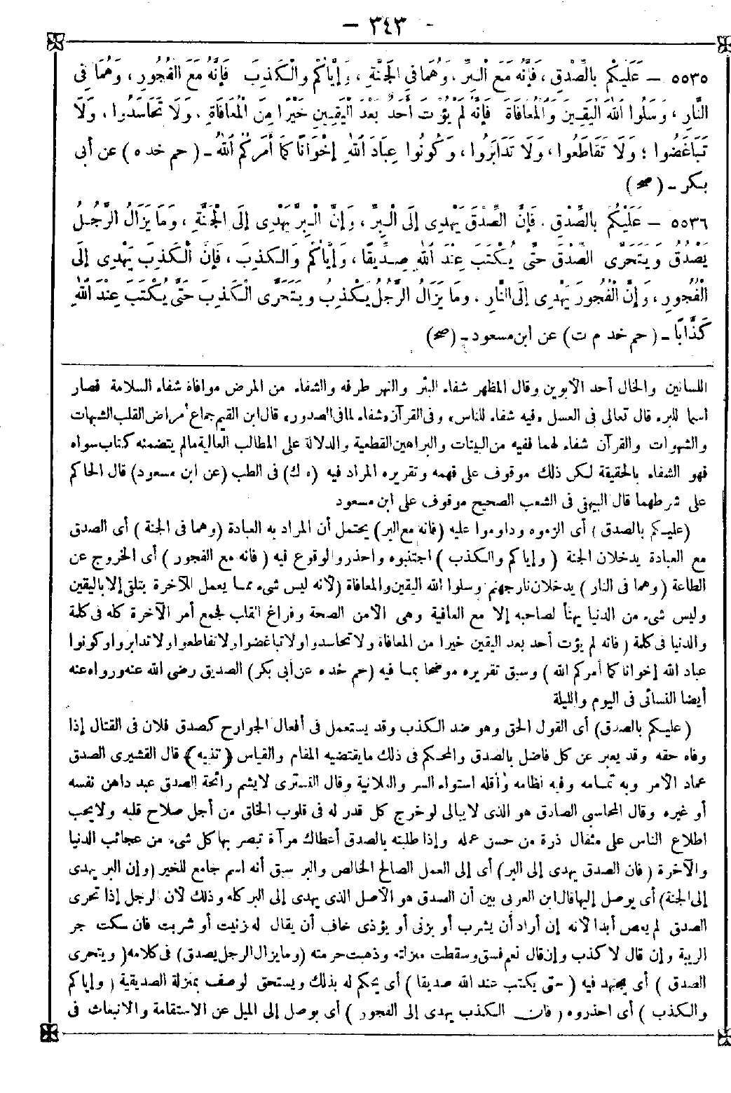 5536 - (عليكم بالصدق) أي القول الحق وهو ضد الكذب وقد يستعمل في أفعال الجوارح كصدق فلان في القتال إذا وفاه حقه وقد يعبر عن كل فاضل بالصدق والمحكم في ذلك ما يقتضيه المقام والقياس <تنبيه> قال القشيري: الصدق عماد الأمر وبه تمامه وفيه نظامه وأقله استواء السر والعلانية وقال التستري: لا يشم رائحة الصدق عبد داهن نفسه أو غيره وقال المحاسبي: الصادق هو الذي لا يبالي لو خرج كل قدر له في قلوب الخلق من أجل صلاح قلبه ولا يحب إطلاع الناس على مثقال ذرة من حسن عمله وإذا طلبته بالصدق أعطاك مرآة تبصر بها كل شيء من عجائب الدنيا والآخرة (فإن الصدق يهدي إلى البر) أي إلى العمل الصالح الخالص والبر سبق أنه اسم جامع للخير (وإن البر يهدي إلى الجنة) أي يوصل إليها قال ابن العربي: بين أن الصدق هو الأصل الذي يهدي إلى البر كله وذلك لأن الرجل إذا تحرى الصدق لم يعص أبدا لأنه إن أراد أن يشرب أو يزني أو يؤذي خاف أن يقال له زنيت أو شربت فإن سكت جر الريبة وإن قال لا كذب وإن قال نعم فسق وسقطت منزلته وذهبت حرمته (وما يزال الرجل يصدق) في كلامه (ويتحرى الصدق) أي يجتهد فيه (حتى يكتب عند الله صديقا) أي يحكم له بذلك ويستحق الوصف بمنزلة الصديقية (وإياكم والكذب) أي احذروه (فإن الكذب يهدي إلى الفجور) أي يوصل إلى الميل عن الاستقامة والإنبعاث في -[344]- المعاصي (وإن الفجور يهدي إلى النار) أي يوصل إليها (وما يزال الرجل يكذب ويتحرى الكذب حتى يكتب عند الله كذابا) أي يحكم له بذلك ويستحق الوصف بمنزلة الكذابين وعاقبتهم والمراد إظهار ذلك لخلقه بكتابته في اللوح أو الصحف أو بالإلقاء في القلوب وعلى الألسنة