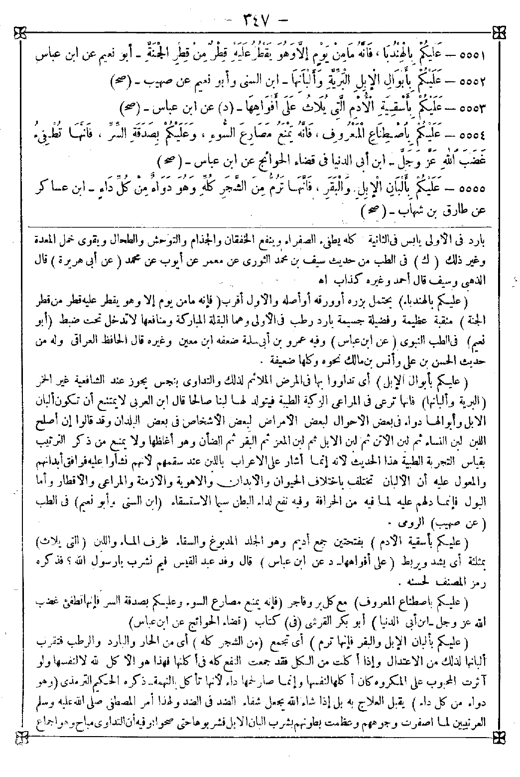 5552 - (عليكم بأبوال الإبل) أي تداووا بها في المرض الملائم لذلك والتداوي بنجس يجوز عند الشافعية غير الخمر (البرية وألبانها) فإنها ترعى في المراعي الزكية الطيبة فيتولد لها لبنا صالحا قال ابن العربي: لا يمتنع أن تكون ألبان الإبل وأبوالها دواء في بعض الأحوال لبعض الأمراض لبعض الأشخاص في بعض البلدان وقد قالوا: إن أصلح اللبن لبن النساء ثم لبن الأتن ثم لبن الإبل ثم لبن المعز ثم البقر ثم الضأن وهو أغلظها ولا يمنع من ذكر الترتيب بقياس التجربة الطبية هذا الحديث لأنه إنما أشار على الأعراب باللبن عند سقمهم لأنهم نشأوا عليه فوافق أبدانهم والمعول عليه أن الألبان تختلف باختلاف الحيوان والأبدان والأهوية والأزمنة والمراعي والأقطار وأما البول فإنما دلهم عليه لما فيه من الحرافة وفيه نفع لداء البطن سيما الاستسقاء