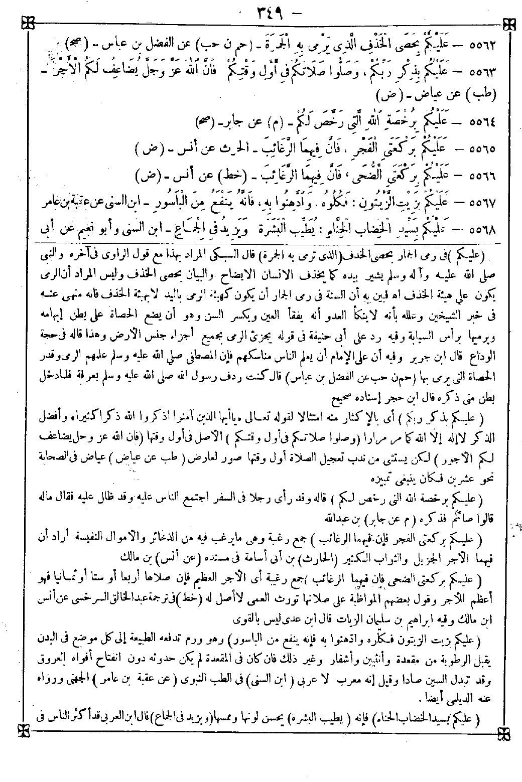 -[349]- 5562 - (عليكم) في رمي الجمار (بحصى الخذف الذي ترمى به الجمرة) قال السبكي: المراد بهذا مع قول الراوي في آخره والنبي صلى الله عليه وسلم يشير بيده كما يخذف الإنسان الإيضاح والبيان بحصى الخذف وليس المراد أن الرمي يكون على هيئة الخذف اه فبين به أن السنة في رمي الجمار أن يكون كهيئة الرمي باليد لا بهيئة الخذف فإنه منهي عنه في خبر الشيخين وعلله بأنه لا ينكأ العدو أنه يفقأ العين ويكسر السن وهو أن يضع الحصاة على بطن إبهامه ويرميها برأس السبابة وفيه رد على أبي حنيفة في قوله يجزئ الرمي بجميع أجزاء جنس الأرض وهذا قاله في حجة الوداع قال ابن جرير: وفيه أن على الإمام أن يعلم الناس مناسكهم فإن المصطفى صلى الله عليه وسلم علمهم الرمي وقدر الحصاة التي يرمى بها