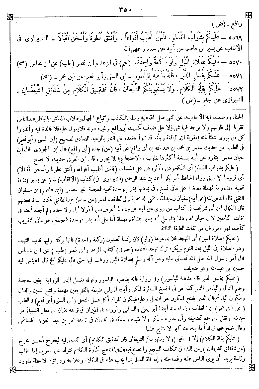 5571 - (عليكم بغسل الدبر فإنه مذهبة للباسور) وفي رواية فإنه يذهب الباسور وقوله بغسل الدبر الرواية بغين معجمة وضم الدال والباء من الدبر كذا هو في النسخ السائرة لكن رأيت الديلمي ضبطه بالقلم بعين مهملة وفتح السين والدال وسكون الباء ثم قال الدبر بفتح فسكون هو النحل وعليه فيكون المراد أكل عسل النحل