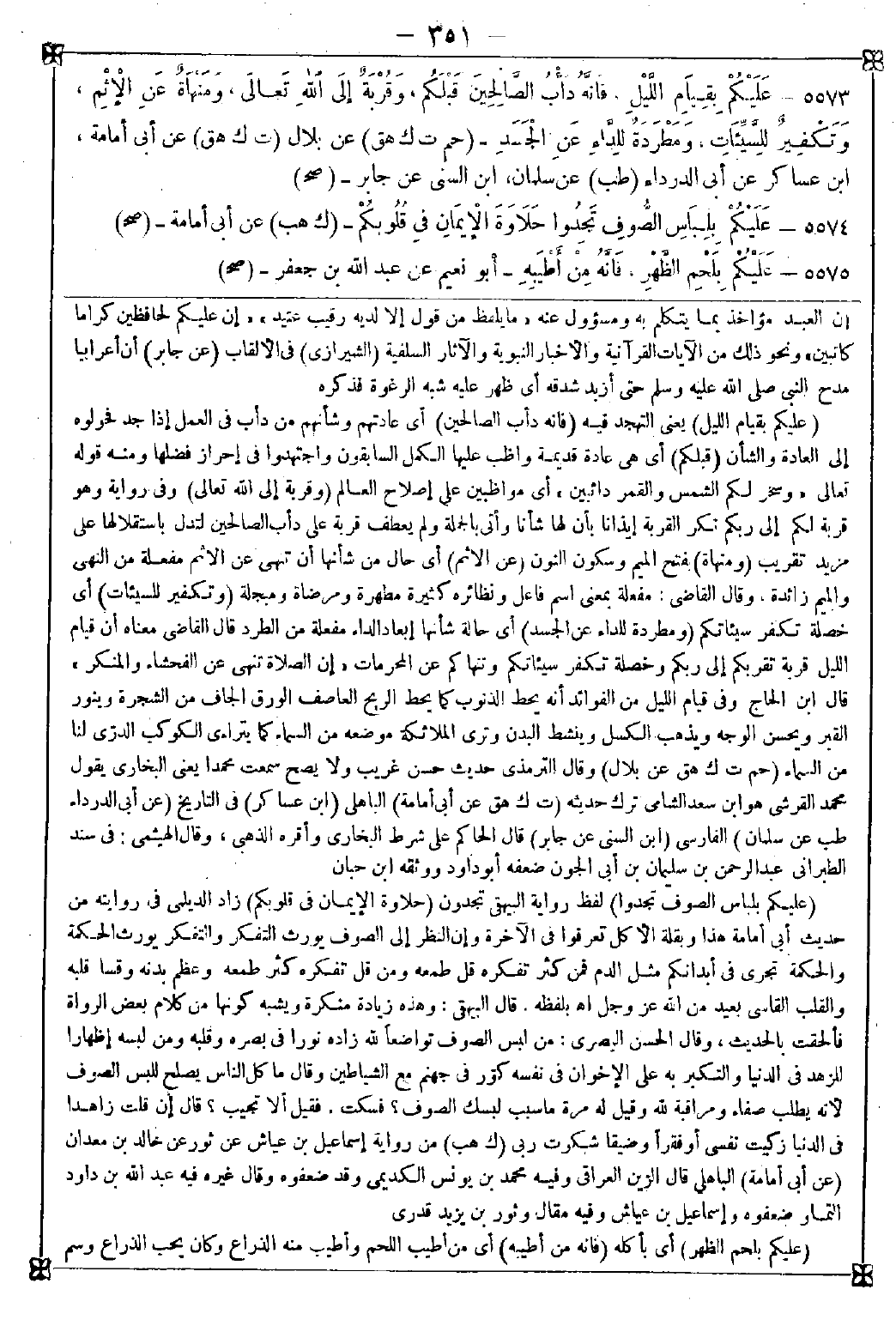 5573 - (عليكم بقيام الليل) يعني التهجد فيه (فإنه دأب الصالحين) أي عادتهم وشأنهم من دأب في العمل إذا جد فحولوه إلى العادة والشأن (قبلكم) أي هي عادة قديمة واظب عليها الكمل السابقون واجتهدوا في إحراز فضلها ومنه قوله تعالى {وسخر لكم الشمس والقمر دائبين} أي مواظبين على إصلاح العالم (وقربة إلى الله تعالى) وفي رواية وهو قربة لكم إلى ربكم نكر القربة إيذانا بأن لها شأنا وأتى بالجملة ولم يعطف قربة على دأب الصالحين لتدل باستقلالها على مزيد تقريب (ومنهاة) بفتح الميم وسكون النون (عن الإثم) أي حال من شأنها أن تنهى عن الإثم مفعلة من النهي والميم زائدة وقال القاضي: مفعلة بمعنى اسم فاعل ونظائره كثيرة مطهرة ومرضاة ومبجلة (وتكفير للسيئات) أي خصلة تكفر سيئاتكم (ومطردة للداء عن الجسد) أي حالة شأنها إبعاد الداء مفعلة من الطرد قال القاضي: معناه أن قيام الليل قربة تقربكم إلى ربكم وخصلة تكفر سيئاتكم وتنهاكم عن المحرمات {إن الصلاة تنهى عن الفحشاء والمنكر} قال ابن الحاج: وفي قيام الليل من الفوائد أنه يحط الذنوب كما يحط الريح العاصف الورق الجاف من الشجرة وينور القبر ويحسن الوجه ويذهب الكسل وينشط البدن وترى الملائكة موضعه من السماء كما يتراءى الكوكب الدري لنا من السماء