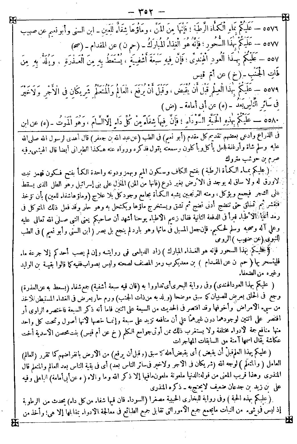 5580 - (عليكم بهذه الحبة) وفي رواية للبخاري الحبيبة مصغرا (السوداء فإن فيها شفاء من كل داء) يحدث من الرطوبة إذ ليس في شيء من النبات ما يجمع جميع الأمور التي تقابل جميع الطبائع في معالجة الأدواء بمقابلها إلا هي وأخذ من -[353]- أحاديث أخر أن معنى كونها شفاء من كل داء أنها لا تستعمل في كل داء صرفا بل ربما استعملت مفردة وربما استعملت مركبة وربما استعملت مسحوقة وغير مسحوقة أكلا وشربا وسعوطا وضمادا وغير ذلك وقيل قوله من كل داء تقديره يقبل العلاج بها فإنها إنما تنفع من الأمراض الباردة لا الحارة إلا بالعرض (إلا السام وهو الموت) أي إلا أن يخلق الله الموت عندها فلا حيلة في دفعه