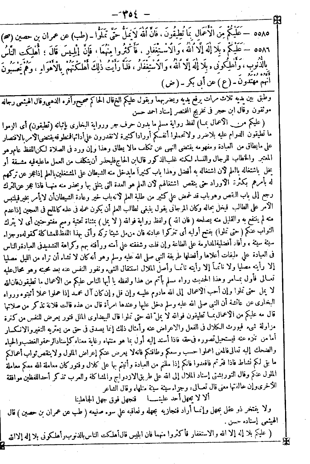 5586 - (عليكم بلا إله إلا الله والاستغفار فأكثروا منهما فإن إبليس قال أهلكت الناس بالذنوب وأهلكوني بلا إله إلا الله -[355]- والاستغفار فلما رأيت ذلك أهلكتهم بالأهواء) جمع هوى مقصور هوى النفس يعني أهلكتهم بميل نفوسهم إلى الأمور المذمومة (وهم) مع ذلك (يحسبون أنهم مهتدون)