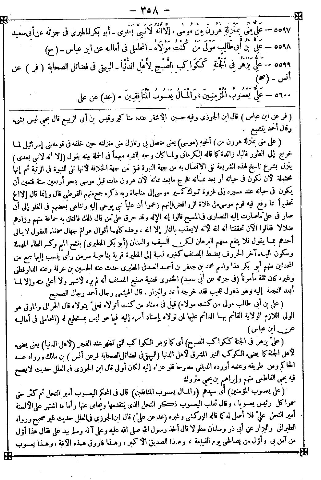 5597 - (علي مني بمنزلة هارون من) أخيه (موسى) يعني متصل بي ونازل مني منزلته حين خلفه في قومه بني إسرائيل لما خرج إلى الطور فالباء زائدة كما قاله الكرماني ولما كان وجه الشبه مبهما في الجملة بينه بقول (إلا أنه لا نبي بعدي) ينزل بشرع ناسخ لهذه الشريعة نفى الاتصال به من جهة النبوة فبقى من جهة الخلافة لأنها تلي النبوة في الرتبة ثم إنها محتملة لأن تكون في حياته أو بعد مماته فخرج بعد مماته لأن هارون مات قبل موسى بنحو أربعين سنة فتعين أن يكون في حياته عند مسيره إلى غزوة تبوك كمسير موسى إلى مناجاة ربه ذكره جمع منهم القرطبي قال: وإنما قال إلا إلخ تحذيرا مما وقع فيه قوم موسى من غلاة الروافض فإنهم زعموا أن عليا نبي يوحى إليه وتناهى بعضهم في الغلو إلى أن صار في علي ما صارت إليه النصارى في المسيح قالوا: إنه الإله وقد حرق علي من قال ذلك فافتتن به جماعة منهم وزادهم ضلالا فقالوا: الآن تحققنا أنه الله لأنه لا يعذب بالنار إلا الله وهذه كلها أقوال عوام جهال سخفاء العقول لا يبالي أحدهم بما يقول فلا ينفع معهم البرهان لكن السيف والسنان
