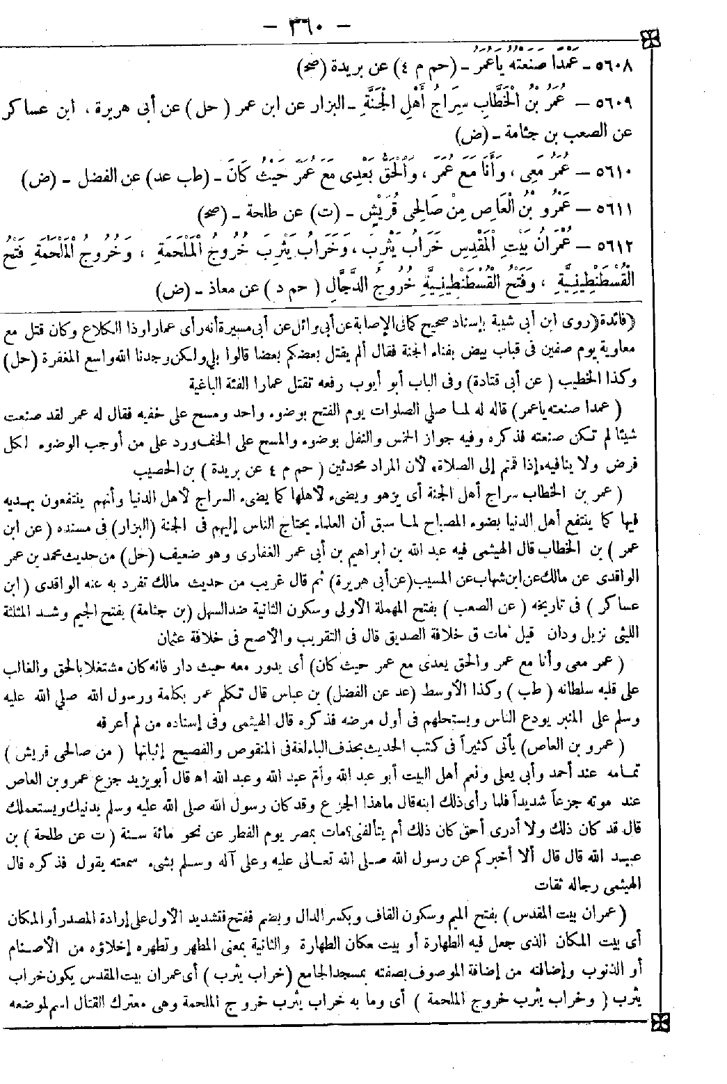 5612 - (عمران بين المقدس) بفتح الميم وسكون القاف وبكسر الدال وبضم ففتح فتشديد الأول على إرادة المصدر أو المكان أي بيت المكان الذي جعل فيه الطهارة أو بيت مكان الطهارة والثانية بمعنى المطهر وتطهره إخلاؤه من الأصنام أو الذنوب وإضافته من إضافة الموصوف بصفته بمسجد الجامع (خراب يثرب) أي عمران بيت المقدس يكون خراب يثرب (وخراب يثرب خروج الملحمة) أي وما به خراب يثرب خروج الملحمة وهي معترك القتال اسم لموضعه -[361]- أي موضع التحام القتال ذكره ابن قرقول. وفي النهاية هي الحرب وموضعه يعني أنها اسم لمجموع ذلك. قال الجوهري: الوقعة العظيمة فزاد الوصف بالعظم (وخروج الملحمة فتح القسطنطينية) وهو لخروج الدجال جعل المصطفى صلى الله عليه وسلم كل واحد منهما عين ما بعده وعبر به عنه