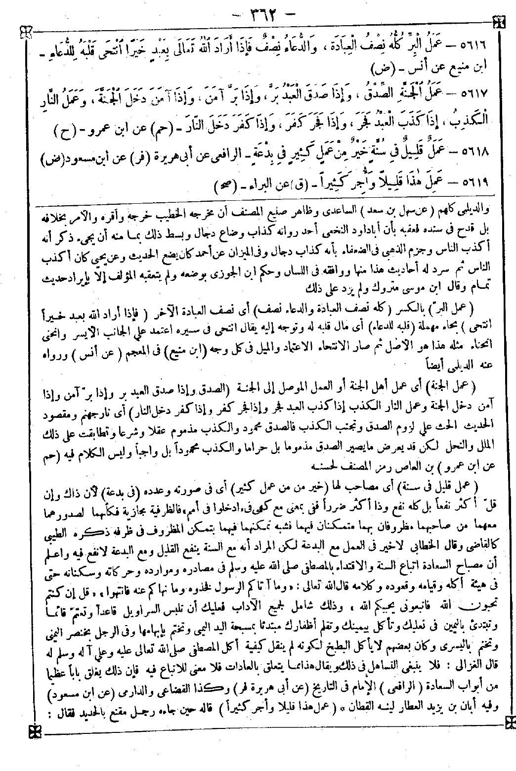 5618 - (عمل قليل في سنة) أي مصاحب لها (خير من عمل كثير) أي في صورته وعدده (في بدعة) لأن ذاك وإن قل أكثر نفعا وذا أكثر ضررا ففي بمعنى مع كهي في {ادخلوا في أمم} فالظرفية مجازية فكأنهما لصدورهما معهما من صاحبهما مظروفان بهما متمكنان فيهما تشبه تمكنهما فيهما بتمكن المظروف في ظرفه ذكره الطيبي كالقاضي. وقال الخطابي: لا خير في العمل مع البدعة لكن المراد أنه مع السنة ينفع القليل ومع البدعة لا نفع فيه واعلم أن مصباح السعادة اتباع السنة والاقتداء بالمصطفى صلى الله عليه وسلم في مصادره وموارده وحركاته وسكناته حتى في هيئة أكله وقيامه وقعوده وكلامه قال الله تعالى: {وما آتاكم الرسول فخذوه ومن نهاكم عنه فانتهوا} {قل إن كنتم تحبون الله فاتبعوني يحببكم الله} وذلك شامل لجميع الآداب فعليك أن تلبس السراويل قاعدا وتعتم قائما وتبتدئ باليمين في نعليك وتأكل بيمينك وتقلم أظفارك مبتدئا بمسبحة اليد اليمنى وتختم بإبهامها وفي الرجل بخنصر اليمنى وتختم باليسرى وكان بعضهم لا يأكل البطيخ لكونه لم ينقل كيفية أكل المصطفى صلى الله تعالى عليه وعلى آله وسلم له قال الغزالي: فلا ينبغي التساهل في ذلك ويقال هذا مما يتعلق بالعادات فلا معنى للاتباع فيه فإن ذلك يغلق بابا عظيما من أبواب السعادة