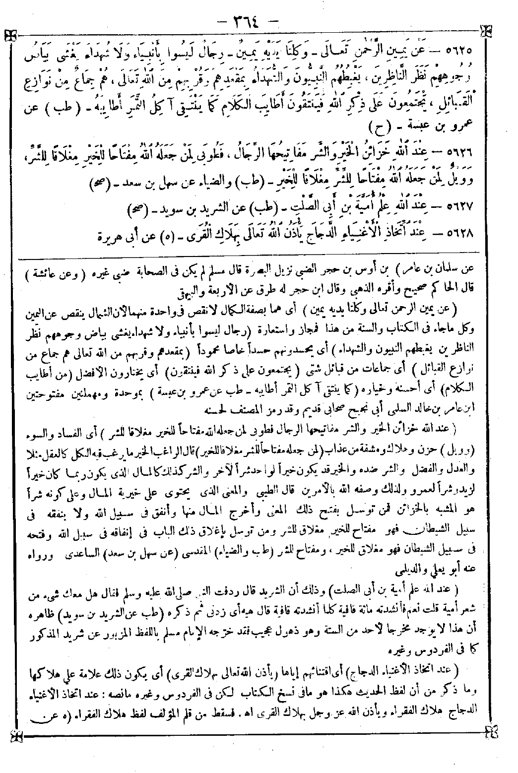 5625 - (عن يمين الرحمن تعالى وكلتا يديه يمين) أي هما بصفة الكمال لا نقص في واحدة منهما لأن الشمال ينقص عن اليمين وكل ما جاء في الكتاب والسنة من هذا فمجاز واستعارة (رجال ليسوا بأنبياء ولا شهداء يغشى بياض وجوههم نظر الناظرين يغبطهم النبيون والشهداء) أي يحسدونهم حسدا خاصا محمودا (بمقعدهم وقربهم من الله تعالى هم جماع من نوازع القبائل) أي جماعات من قبائل شتى (يجتمعون على ذكر الله فينتقون) أي يختارون الأفضل (من أطايب الكلام) أي أحسنه وخياره (كما ينتقي آكل التمر أطايبه)