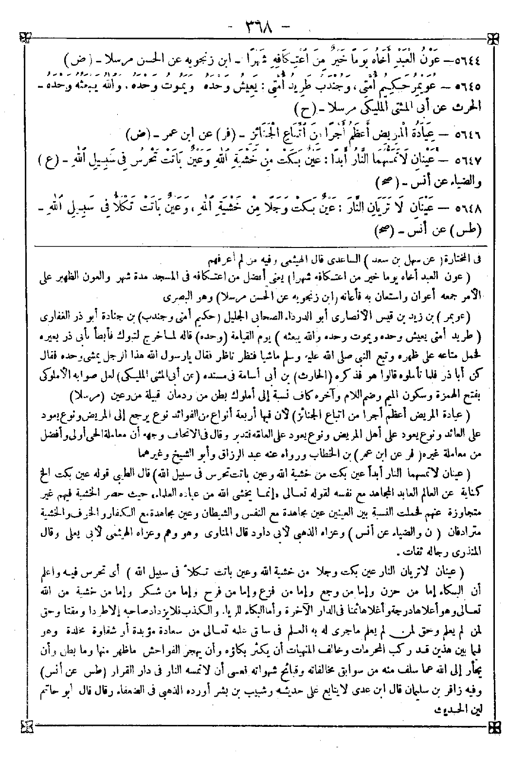 5647 - (عينان لا تمسهما النار أبدا عين بكت من خشية الله وعين باتت تحرس في سبيل الله) قال الطيبي: قوله عين بكت إلخ كناية عن العالم العابد المجاهد مع نفسه لقوله تعالى {إنما يخشى الله من عباده العلماء} حيث حصر الخشية فيهم غير متجاوزة عنهم فحملت النسبة بين العينين عين مجاهدة مع النفس والشيطان وعين مجاهدة مع الكفار والخوف والخشية مترادفان