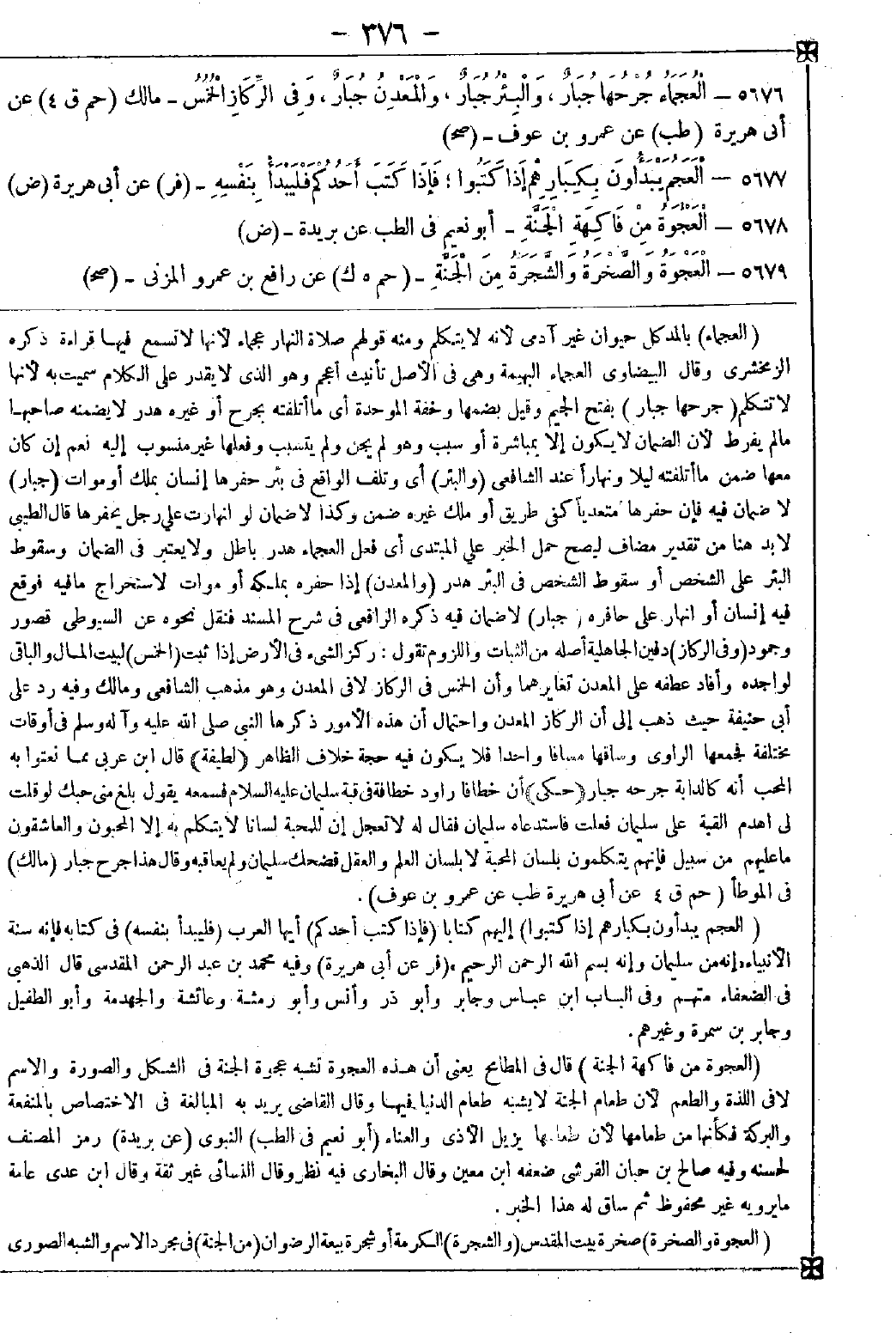 -[376]- 5676 - (العجماء) بالمد كل حيوان غير آدمي لأنه لا يتكلم ومنه قولهم صلاة النهار عجماء لأنها لا تسمع فيها قراءة ذكره الزمخشري. وقال البيضاوي: العجماء البهيمة وهي في الأصل تأنيث أعجم وهو الذي لا يقدر على الكلام سميت به لأنها لا تتكلم (جرحها جبار) بفتح الجيم وقيل بضمها وخفة الموحدة أي ما أتلفته بجرح أو غيره هدر لا يضمنه صاحبها ما لم يفرط لأن الضمان لا يكون إلا بمباشرة أو سبب وهو لم يجن ولم يتسبب وفعلها غير منسوب إليه نعم إن كان معها ضمن ما أتلفته ليلا ونهارا عند الشافعي (والبئر) أي وتلف الواقع في بئر حفرها إنسان بملك أو موات (جبار) لا ضمان فيه فإن حفرها متعديا كفى طريق أو ملك غيره ضمن وكذا لا ضمان لو انهارت على رجل يحفرها قال الطيبي: لا بد هنا من تقدير مضاف ليصح حمل الخبر على المبتدي أي فعل العجماء هدر باطل ولا يعتبر في الضمان وسقوط البئر على الشخص أو سقوط الشخص في البئر هدر (والمعدن) إذا حفره بملكه أو موات لاستخراج ما فيه فوقع فيه إنسان أو انهار على حافره (جبار) لا ضمان فيه ذكره الرافعي في شرح المسند فنقل نحوه عن السيوطي قصور وجمود (وفي الركاز) دفين الجاهلية أصله من الثبات واللزوم تقول: ركز الشيء في الأرض إذا ثبت (الخمس) لبيت المال والباقي لواجده وأفاد عطفه على المعدن تغايرهما وأن الخمس في الركاز لا في المعدن وهو مذهب الشافعي ومالك وفيه رد على أبي حنيفة حيث ذهب إلى أن الركاز المعدن واحتمال أن هذه الأمور ذكرها النبي صلى الله عليه وآله وسلم في أوقات مختلفة فجمعها الراوي وساقها مساقا واحدا فلا يكون فيه حجة خلاف الظاهر. (لطيفة) قال ابن عربي: مما نعتوا به المحب كالدابة جرحه جبار (حكى) أن خطافا راود خطافة في قبة سليمان عليه السلام فسمعه يقول بلغ مني حبك لو قلت لي اهدم القبة على سليمان فعلت فاستدعاه سليمان فقال له لا تعجل إن للمحبة لسانا لا يتكلم به إلا المحبون والعاشقون ما عليهم من سبيل فإنهم يتكلمون بلسان المحبة لا بلسان العلم والعقل فضحك سليمان ولم يعاقبه وقال هذا جرح جبار