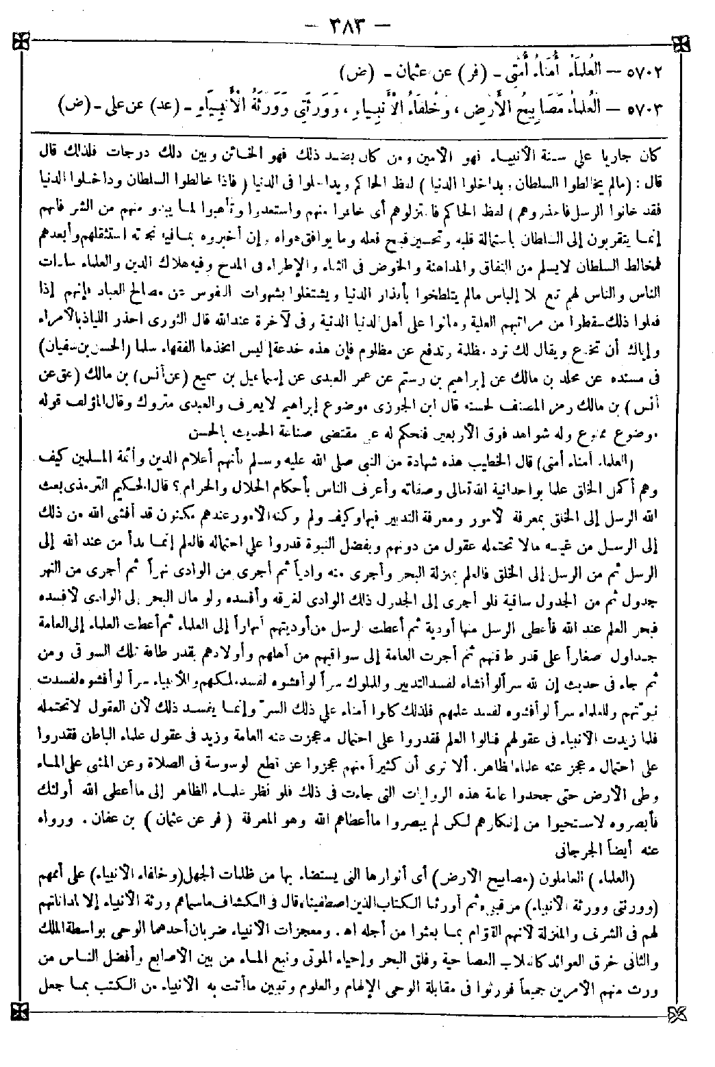5702 - (العلماء أمناء أمتي) قال الخطيب: هذه شهادة من النبي صلى الله عليه وسلم بأنهم أعلام الدين وأئمة المسلمين كيف وهم أكمل الخلق علما بوحدانية الله تعالى وصفاته وأعرف الناس بأحكام الحلال والحرام؟ قال الحكيم الترمذي: بعث الله الرسل إلى الخلق بمعرفة الأمور ومعرفة التدبير فيها وكيف ولم وكنه الأمور عندهم مكنون قد أفشى الله من ذلك إلى الرسل من غيبه ما لا تحتمله عقول من دونهم وبفضل النبوة قدروا على احتماله فالعلم إنما بدأ من عند الله إلى الرسل ثم من عند الرسل إلى الخلق فالعلم بمنزلة البحر وأجرى منه واديا ثم أجرى من الوادي نهرا ثم أجرى من النهر جدول ثم من الجدول ساقية فلو أجرى إلى الجدول ذلك الوادي لغرقه وأفسده ولو مال البحر إلى الوادي لأفسده فبحر العلم عند الله فأعطى الرسل منها أودية ثم أعطت الرسل من أوديتهم أنهارا إلى العلماء ثم أعطت العلماء إلى العامة جداول صغارا على قدر طاقتهم ثم أجرت العامة إلى سواقيهم من أهلهم وأولادهم بقدر طاقة تلك السواقي ومن ثم جاء في حديث إن لله سرا لو أفشاه لفسد التدبير وللملوك سرا لو أفشوه لفسد ملكهم وللأنبياء سرا لو أفشوه لفسدت نبوتهم وللعلماء سرا لو أفشوه لفسد علمهم فلذلك كانوا أمناء على ذلك السر وإنما يفسد ذلك لأن العقول لا تحتمله فلما زيدت الأنبياء في عقولهم فنالوا العلم فقدروا على احتمال ما عجزت عنه العامة وزيد في عقول علماء الباطن فقدروا على احتمال ما عجز عنه علماء الظاهر. ألا ترى أن كثيرا منهم عجزوا عن قطع الوسوسة في الصلاة وعن المشي على الماء وطي الأرض حتى جحدوا عامة هذه الروايات التي جاءت في ذلك فلو نظر علماء الظاهر إلى ما أعطى الله أولئك فأبصروه لاستحيوا من إنكارهم لكن لم يبصروا ما أعطاهم الله وهو المعرفة