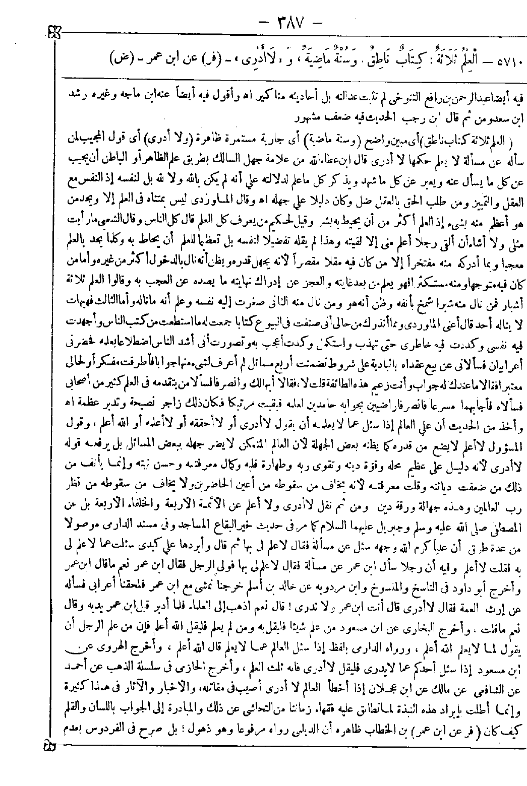 5710 - (العلم ثلاثة كتاب ناطق) أي مبين واضح (وسنة ماضية) أي جارية مستمرة ظاهرة (ولا أدري) أي قول المجيب لمن سأله عن مسألة لا يعلم حكمها لا أدري قال ابن عطاء الله: من علامة جهل السالك بطريق علم الظاهر أو الباطن أن يجيب عن كل ما يسأل عنه ويعبر عن كل ما شهد ويذكر كل ما علم لدلالته على أنه لم يكن بالله ولا لله بل لنفسه إذ النفس مع العقل والتمييز ومن طلب الحق بالعقل ضل وكان دليلا على جهله اه. وقال الماوردي: ليس بمتناه في العلم إلا ويجد من هو أعظم منه بشيء إذ العلم أكثر من أن يحيط به بشر وقيل لحكيم: من يعرف كل العلم قال: كل الناس وقال الشعبي: ما رأيت مثلي ولا أشاء أن ألقي رجلا أعلم مني إلا لقيته وهذا لم يقله تفضيلا لنفسه بل تعظيما للعلم أن يحاط به وكلما يجد بالعلم معجبا وبما أدركه منه مفتخرا إلا من كان فيه مقلا مقصرا لأنه يجهل قدره ويظن أنه نال بالدخول أكثر من غيره وأما من كان فيه متوجها ومنه مستكثرا فهو يعلم من بعد غايته والعجز عن إدراك نهايته ما يصده عن العجب به وقالوا: العلم ثلاثة أشبار فمن نال منه شبرا شمخ بأنفه وظن أنه هو ومن نال منه الثاني صغرت إليه نفسه وعلم أنه ما ناله وأما الثالث فهيهات لا يناله أحد قال أعني الماوردي: ومما أنذرك من حالي أني صنفت في البيوع كتابا جمعت له ما استطعت من كتب الناس وأجهدت فيه نفسي وكدرت فيه خاطري حتى تهذب واستكمل وكدت أعجب به وتصورت أني أشد الناس اضطلاعا بعلمه فحضرني أعرابيان فسألاني عن بيع عقداه بالبادية على شروط تضمنت أربع مسائل لم أعرف لشيء منها جوابا فأطرقت مفكرا ولحالي معتبرا فقالا: ما عندك له جواب وأنت زعيم هذه الطائفة قلت: لا فقالا: أيها لك وانصرفا فسألا من يتقدمه في العلم كثير من أصحابي فسألاه فأجابهما مسرعا فانصرفا راضيين بجوابه حامدين لعلمه فبقيت مرتبكا فكان ذلك زاجر نصيحة وتدبر عظمة اه. وأخذ من الحديث أن على العالم إذا سئل عما لا يعلمه أن يقول لا أدري أو لا أحققه أو لا أعلمه أو الله أعلم وقول المسؤول لا أعلم لا يضع من قدره كما يظنه بعض الجهلة لأن العالم المتمكن لا يضر جهله ببعض المسائل بل يرفعه قوله لا أدري لأنه دليل على عظيم محله وقوة دينه وتقوى ربه وطهارة قلبه وكمال معرفته وحسن نيته وإنما يأنف من ذلك من ضعفت ديانته وقلت معرفته لأنه يخاف من سقوطه من أعين الحاضرين ولا يخاف من سقوطه من نظر رب العالمين وهذه جهالة ورقة دين ومن ثم نقل لا أدري ولا أعلم عن الأئمة الأربعة والخلفاء الأربعة بل عن المصطفى صلى الله عليه وسلم وجبريل عليهما السلام كما مر في حديث خير البقاع المساجد وفي مسند الدارمي موصولا من عدة طرق أن عليا كرم الله وجهه سئل عن مسألة فقال: لا علم لي بها ثم قال: وأبردها على كبدي سئلت عما لا علم لي به فقلت لا أعلم وفيه أن رجلا سأل ابن عمر عن مسألة فقال: لا علم لي بها فولى الرجل فقال ابن عمر: نعم ما قال ابن عمر وأخرج أبو داود في الناسخ والمنسوخ وابن مردويه عن خالد بن أسلم خرجنا نمشي مع ابن عمر فلحقنا أعرابي فسأله عن إرث العمة فقال: لا أدري قال: أنت ابن عمر ولا تدري قال: نعم اذهب إلى العلماء فلما أدبر قبل ابن عمر يديه وقال: نعم ما قلت وأخرج البخاري عن ابن مسعود من علم شيئا فليقل به ومن لم يعلم فليقل الله أعلم فإن من علم الرجل أن يقول لما لا يعلم الله أعلم ورواه الدارمي بلفظ إذا سئل العالم عما لا يعلم قال: الله أعلم وأخرج الهروي عن ابن مسعود إذا سئل أحدكم عما لا يدري فليقل لا أدري فإنه ثلث العلم وأخرج الحازمي في سلسلة الذهب عن أحمد عن الشافعي عن مالك عن ابن عجلان: إذا أخطأ العالم لا أدري أصيب في مقاتله والأخبار والآثار في هذا كثيرة وإنما أطلت بإيراد هذه النبذة لما تطابق عليه فقهاء زماننا من التحاشي عن ذلك والمبادرة إلى الجواب باللسان والقلم كيف كان