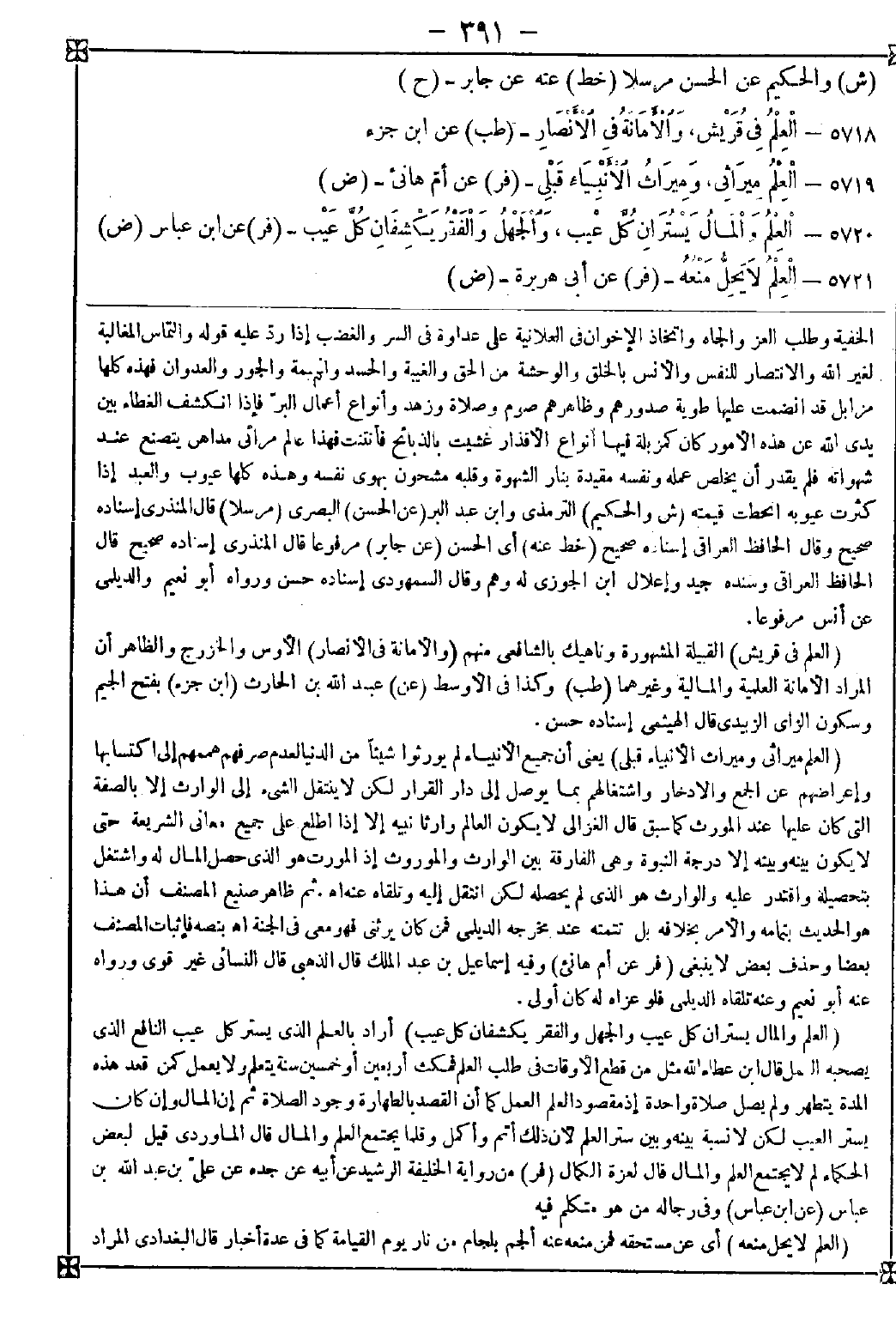 5719 - (العلم ميراثي وميراث الأنبياء قبلي) يعني أن جميع الأنبياء لم يورثوا شيئا من الدنيا لعدم صرفهم هممهم إلى اكتسابها وإعراضهم عن الجمع والادخار واشتغالهم بما يوصل إلى دار القرار لكن لا ينتقل الشيء إلى الوارث إلا بالصفة التي كان عليها عند المورث كما سبق قال الغزالي: لا يكون العالم وارثا نبيه إلا إذا اطلع على جميع معاني الشريعة حتى لا يكون بينه وبينه إلا درجة النبوة وهي الفارقة بين الوارث والموروث إذ المورث هو الذي حصل المال له واشتغل بتحصيله واقتدر عليه والوارث هو الذي لم يحصله لكن انتقل إليه وتلقاه عنه اه. ثم ظاهر صنيع المصنف أن هذا هو الحديث بتمامه والأمر بخلافه بل تتمته عند مخرجه الديلمي فمن كان يرثني فهو معي في الجنة اه. بنصه فإثبات المصنف بعضا وحذف بعض لا ينبغي