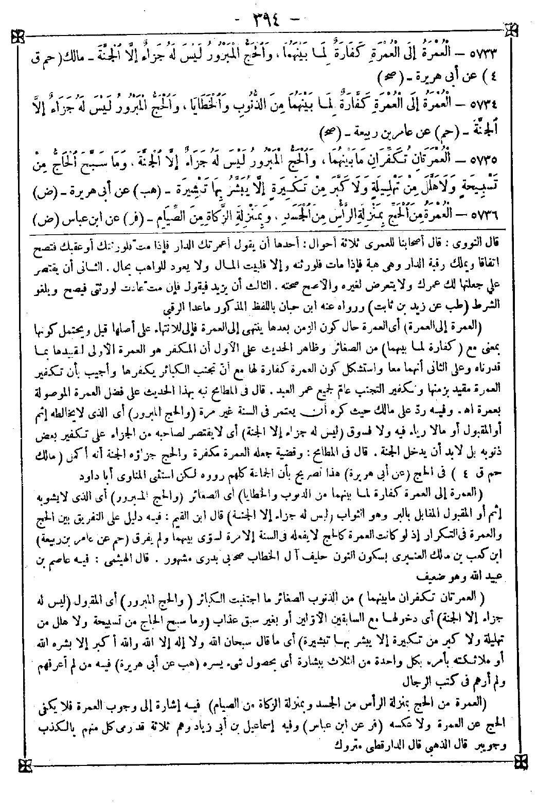 5735 - (العمرتان تكفران ما بينهما) من الذنوب الصغائر ما اجتنبت الكبائر (والحج المبرور) أي المقبول (ليس له جزاء إلا الجنة) أي دخولها مع السابقين الأولين أو بغير سبق عذاب (وما سبح الحاج من تسبيحة ولا هلل من تهليلة ولا كبر من تكبيرة إلا يبشر بها تبشيرة) أي ما قال سبحان الله ولا إله إلا الله والله أكبر إلا بشره الله أو ملائكته بأمره بكل واحدة من الثلاث ببشارة أي بحصول شيء يسره