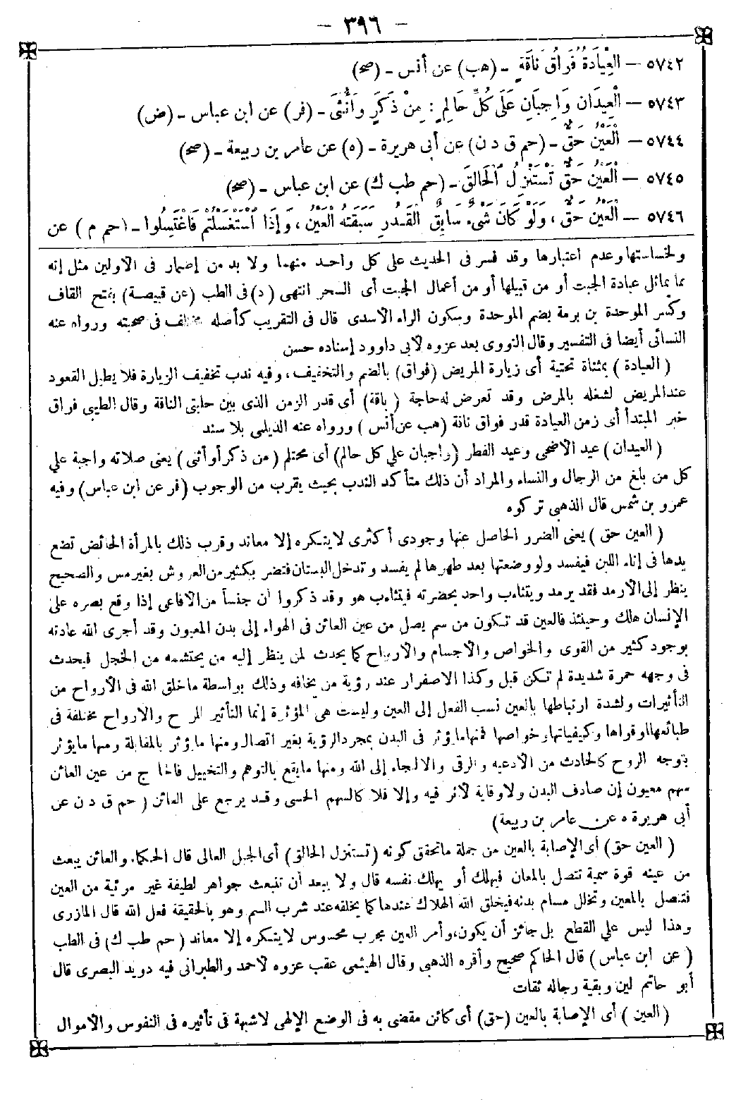 5744 - (العين حق) يعني الضرر الحاصل عنها وجودي أكثري لا ينكره إلا معاند وقرب ذلك بالمرأة الحائض تضع يدها في إناء اللبن فيفسد ولو وضعتها بعد طهرها لم يفسد وتدخل البستان فتضر بكثير من العروش بغير مس والصحيح ينظر إلى الأرمد فقد يرمد ويتثاءب واحد بحضرته فيتثاءب هو وقد ذكروا أن جنسا من الأفاعي إذا وقع بصره على الإنسان هلك وحينئذ فالعين قد تكون من سم يصل من عين العائن في الهواء إلى بدن المعيون وقد أجرى الله عادته بوجود كثير من القوى والخواص والأجسام والأرواح كما يحدث لمن ينظر إليه من يحتشمه من الخجل فيحدث في وجهه حمرة شديدة لم تكن قبل وكذا الاصفرار عند رؤية من يخافه وذلك بواسطة ما خلق الله في الأرواح من التأثيرات ولشدة ارتباطها بالعين نسب الفعل إلى العين وليست هي المؤثرة إنما التأثير للروح والأرواح مختلفة في طبائعها وقواها وكيفياتها وخواصها فمنها ما يؤثر في البدن بمجرد الرؤية بغير اتصال ومنها ما يؤثر بالمقابلة ومنها ما يؤثر بتوجه الروح كالحادث من الأدعية والرقى والالتجاء إلى الله ومنها ما يقع بالتوهم والتخييل فالخارج من عين العائن سهم معيون إن صادف البدن ولا وقاية لأثر فيه وإلا فلا كالسهم الحسي وقد يرجع على العائن