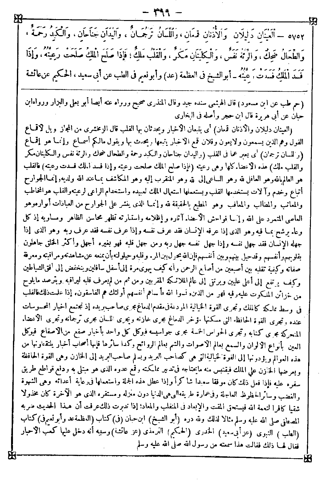 5752 - (العينان دليلان والأذنان قمعان) أي يتبعان الأخبار ويحدثان بها القلب قال الزمخشري: من المجاز ويل لأقماع القول وهم الذين يسمعون ولا يعون وفلان قمع الأخبار يتبعها ويحدث بها ويقول ما لكم أسماع وإنما هو إقماع (واللسان ترجمان) أي يعبر عما في القلب (واليدان جناحان والكبد رحمة والطحال ضحك والرئة نفس والكليتان مكر والقلب ملك) هذه الأعضاء كلها وهي رعيته (فإذا صلح الملك صلحت رعيته وإذا فسد الملك فسدت رعيته) فالقلب هو العالم بالله وهو العاقل لله وهو الساعي إلى الله وهو المتقرب إليه وهو المكاشف بما عند الله ولديه وإنما الجوارح أتباع وخدم وآلات يستخدمها القلب ويستعملها استعمال الملك لعبيده واستخدام الراعي لرعيته والقلب هو المخاطب والمعاتب والمطالب والمعاقب وهو المطيع بالحقيقة لله وإنما الذي ينشر على الجوارح من العبادات أنواره وهو العاصي المتمرد على الله وإنما فواحش الأعضاء آثاره وإظلامه واستنارته تظهر محاسن الظاهر ومساويه إذ كل وعاء يرشح بما فيه وهو الذي إذا عرفه الإنسان فقد عرف نفسه وإذا عرف نفسه فقد عرف ربه وهو الذي إذا جهله الإنسان فقد جهل نفسه وإذا جهل نفسه جهل ربه ومن جهل قلبه فهو بغيره أجهل وأكثر الخلق جاهلون بقلوبهم وأنفسهم وقد حيل بينهم وبين أنفسهم فإن الله يحول بين المرء وقلبه وحيلولته بأن يمنعه عن مشاهدته ومراقبته ومعرفة صفاته وكيفية تقلبه بين أصبعين من أصابع الرحمن وأنه كيف يهوي مرة إلى أسفل سافلين وينخفض إلى أفق الشياطين وكيف يرتفع إلى أعلى عليين ويرتقي إلى عالم الملائكة المقربين ومن ثم من لم يعرف قلبه ليراقبه ويترصد ما يلوح من خزائن الملكوت عليه وفيه فهو من الذين {نسوا الله فأنساهم أنفسهم أولئك هم الفاسقون} إذا علمت ذلك فالقلب في وسط مملكة كالملك وتجري القوة الخيالية المودعة في مقدم الدماغ مجرى صاحب بريده إذ تجتمع أخبار المحسوسات عنده وتجري القوة الحافظة التي مسكنها مؤخر الدماغ مجرى خازنه ويجري اللسان مجرى ترجمانه وتجري الأعضاء المتحركة مجرى كتابه وتجري الحواس الخمسة مجرى جواسيسه فيوكل كل واحد بأخبار صقع من الأصقاع فيوكل العين بأنواع الألوان والسمع بعالم الأصوات والشم بعالم الروائح وكذا سائرها فإنها أصحاب أخبار يلتقطونها من هذه العوالم ويؤدونها إلى القوة الخيالية التي هي كصاحب البريد ويسلم صاحب البريد إلى الخازن وهي القوة الحافظة ويعرضها الخازن على الملك فيقتبس منه ما يحتاجه في تدبير مملكته وقمع عدوه الذي هو مبتلى به ودفع قواطع طريق سفره عليه فإذا فعل ذلك كان موفقا سعيدا شاكرا وإذا عطل هذه الجملة واستعملها في رعاية أعداءه وهي الشهوة والغضب وسائر الحظوظ العاجلة وفي عمارة طريقه التي هي الدنيا دون منزله ومستقره الذي هو الآخرة كان مخذولا شقيا كافرا لنعمة الله فيستحق المقت والإبعاد في المنقلب والمعاد إذا تدبرت ذلك عرفت أن هذا الحديث ضربه المصطفى صلى الله عليه وسلم مثالا لذلك ولله دره