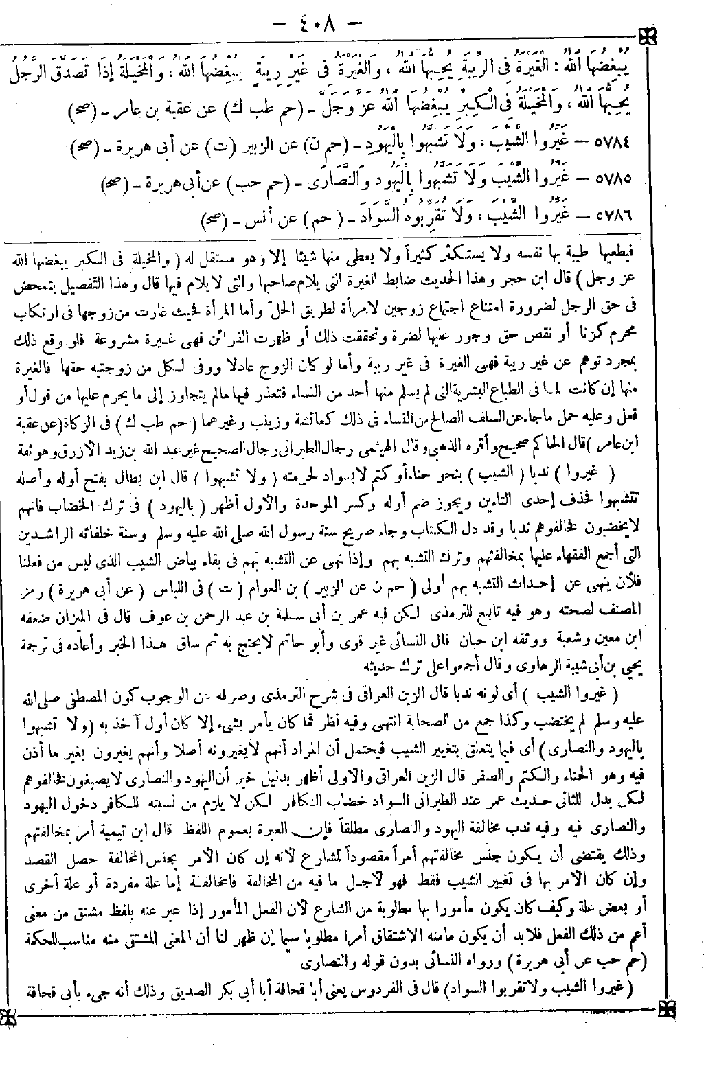 5786 - (غيروا الشيب ولا تقربوا السواد) قال في الفردوس: يعني أبا قحافة أبا أبي بكر الصديق وذلك أنه جيء بأبي قحافة -[409]- يوم الفتح وكان رأسه ولحيته ثغامة بيضاء فقال ذلك قال ابن حجر: يستحب الخضاب إلا إن كانت عادة أهل بلده ترك الصبغ فإن من يتفرد به عنهم يصير في مقام الشهرة فالترك أولى