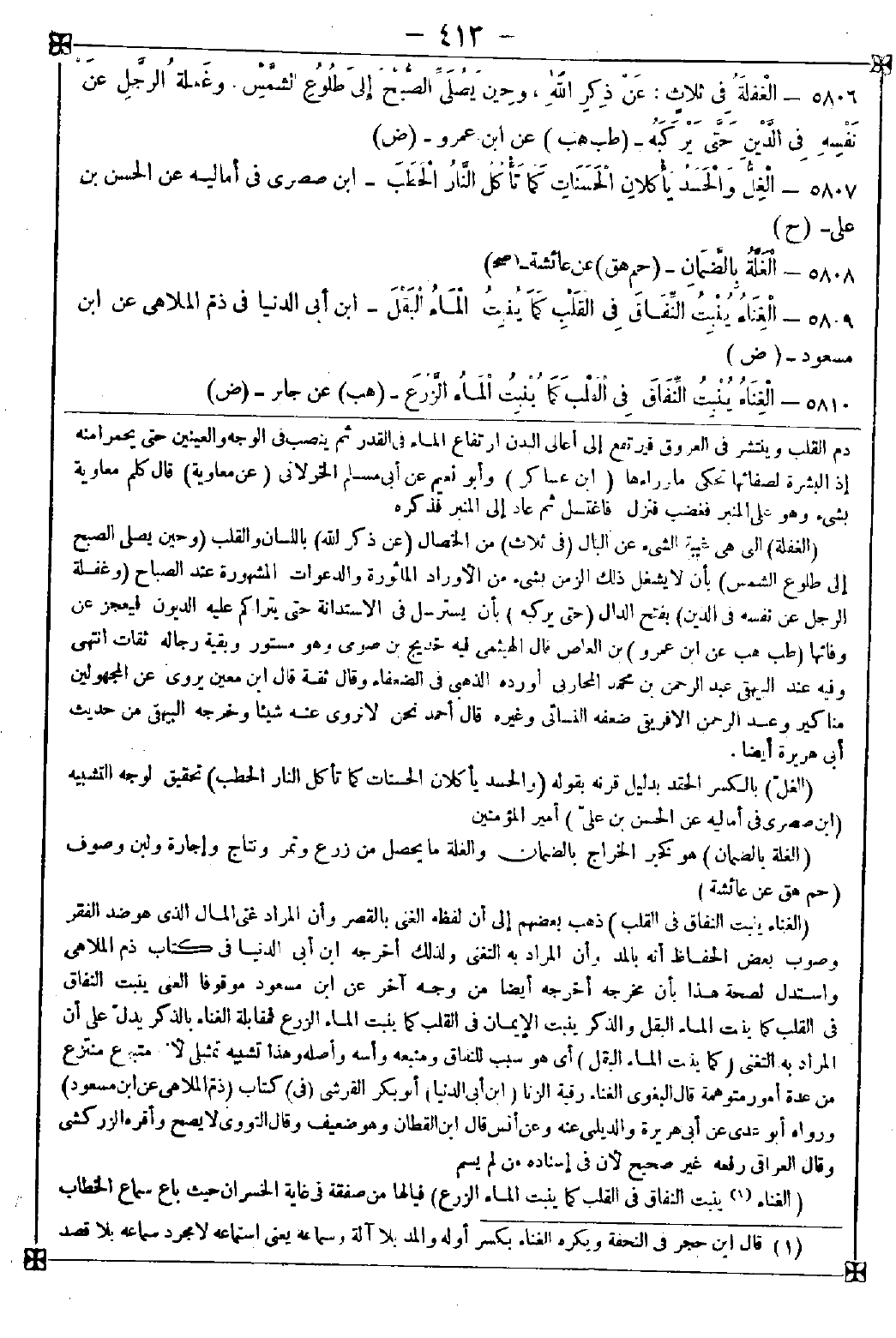 5809 - (الغناء ينبت النفاق في القلب) ذهب بعضهم إلى أن لفظه الغنى بالقصر وأن المراد غنى المال الذي هو ضد الفقر وصوب بعض الحفاظ أنه بالمد وأن المراد به التغني ولذلك أخرجه ابن أبي الدنيا في كتاب ذم الملاهي واستدل لصحة هذا بأن مخرجه أخرجه أيضا من وجه آخر عن ابن مسعود موقوفا أن الغنى ينبت النفاق في القلب كما بنيت الماء البقل والذكر ينبت الإيمان في القلب كما ينبت الماء الزرع فمقابلة الغناء بالذكر يدل على أن المراد به التغني (كما ينبت الماء البقل) أي هو سبب للنفاق ومنبعه وأسه وأصله وهذا تشبيه تمثيلي لأنه متبوع منتزع من عدة أمور متوهمة قال البغوي: الغناء رقية الزنا