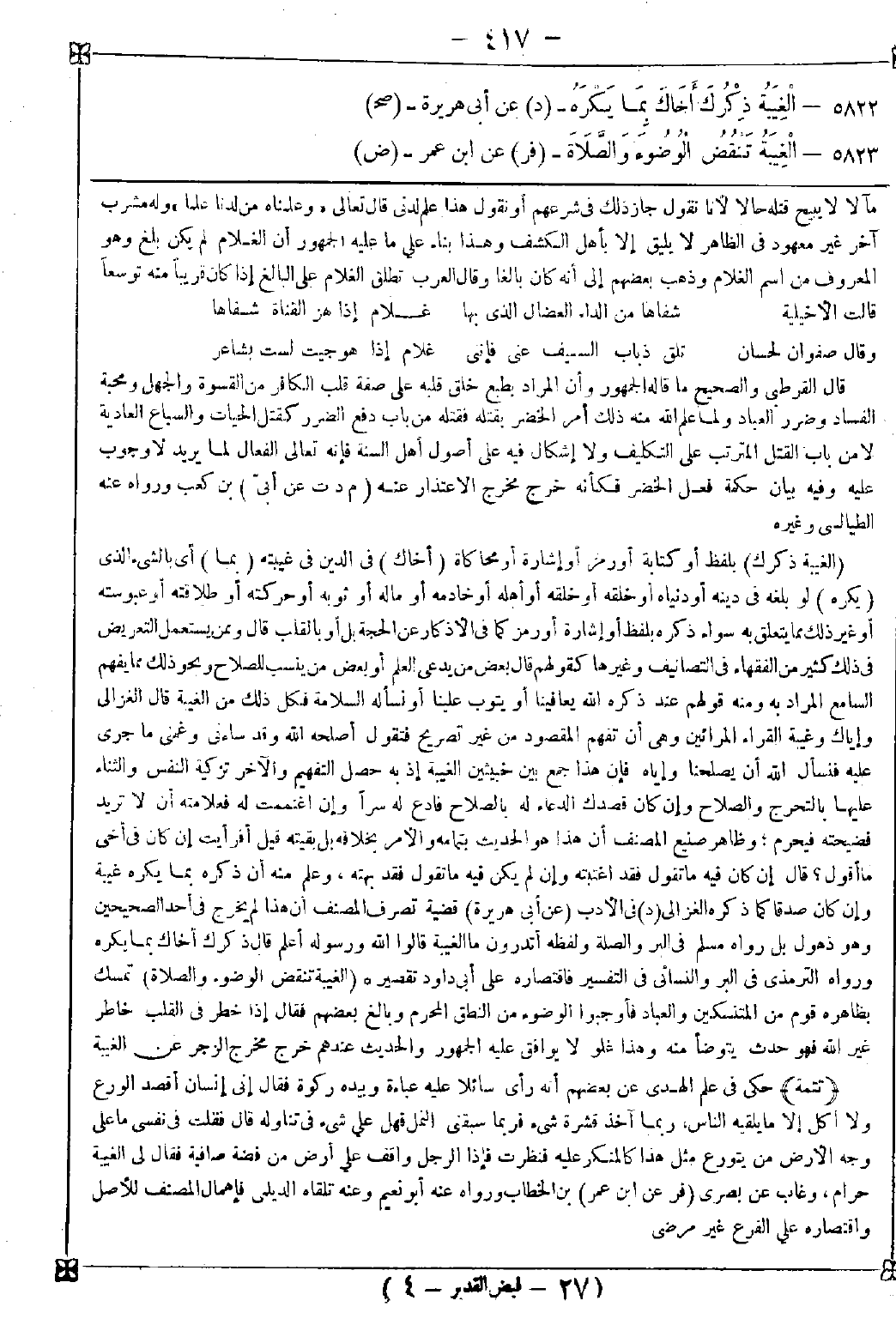 5823 - (الغيبة تنقض الوضوء والصلاة) تمسك بظاهره قوم من المتنسكين والعباد فأوجبوا الوضوء من النطق المحرم وبالغ بعضهم فقال: إذا خطر في القلب خاطر غير الله فهو حدث يتوضأ منه وهذا غلو لا يوافق عليه الجمهور والحديث عندهم خرج مخرج الزجر عن الغيبة