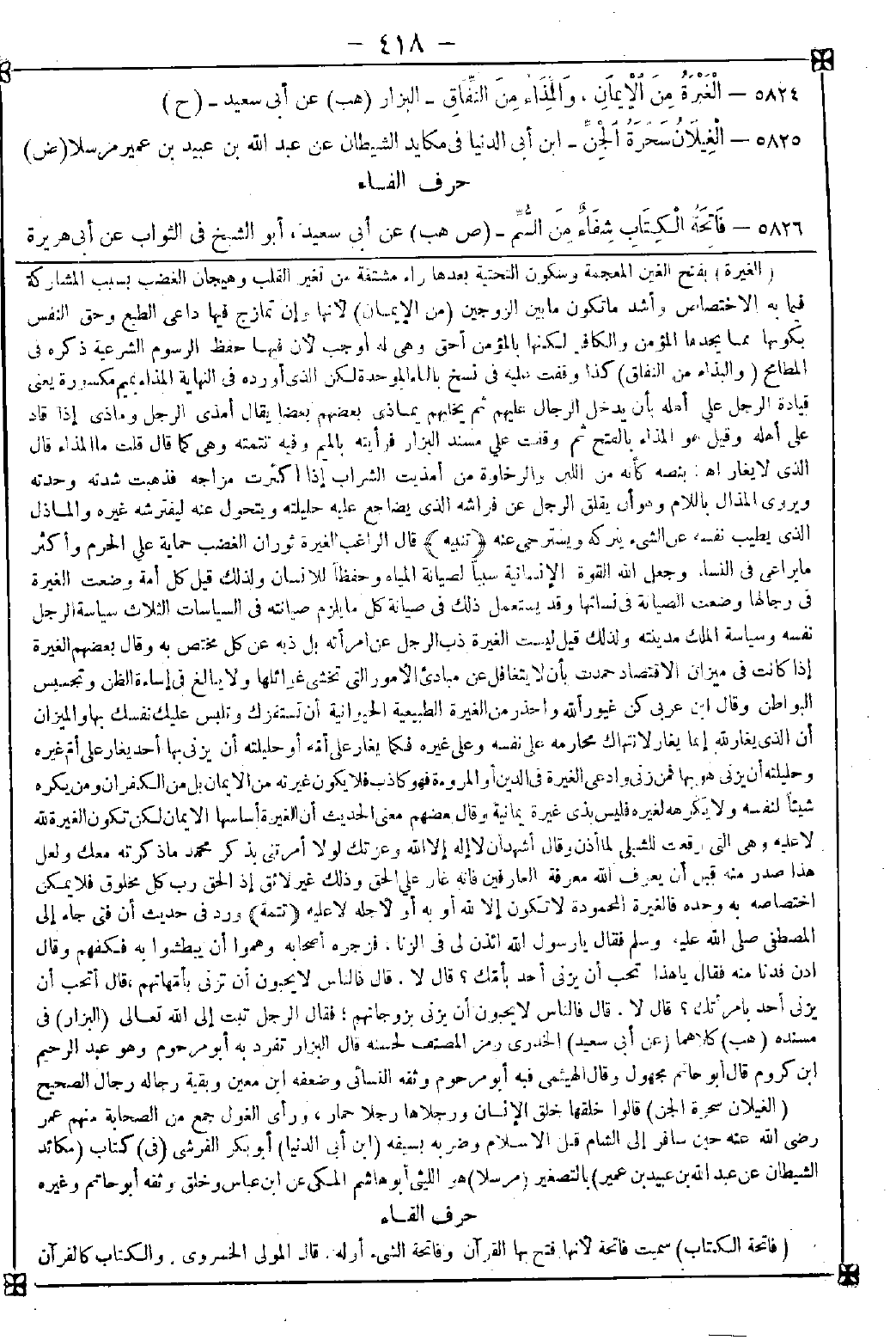 -[418]- 5824 - (الغيرة) بفتح الغين المعجمة وسكون التحتية بعدها راء مشتقة من تغير القلب وهيجان الغضب بسبب المشاركة فيما به الاختصاص وأشد ما تكون ما بين الزوجين (من الإيمان) لأنها وإن تمازج فيها داعي الطبع وحق النفس بكونها مما يجدها المؤمن والكافر لكنها بالمؤمن أحق وهي له أوجب لأن فيها حفظ الرسوم الشرعية ذكره في المطامح (والبذاء من النفاق) كذا وقفت عليه في نسخ بالباء الموحدة لكن الذي أورده في النهاية المذاء بميم مكسورة يعني قيادة الرجل على أهله بأن يدخل الرجال عليهم ثم يخليهم يماذي بعضهم بعضا يقال أمذى الرجل وماذى إذا قاد على أهله وقيل هو المذاء بالفتح ثم وقفت على مسند البزار فرأيته بالميم وفيه تتمته وهي كما قال قلت: ما المذاء قال: الذي لا يغار اه. بنصه كأنه من اللين والرخاوة من أمذيت الشراب إذا أكثرت مزاجه فذهبت شدته وحدته ويروى المذال باللام وهو أن يقلق الرجل عن فراشه الذي يضاجع عليه حليلته ويتحول عنه ليفترشه غيره والماذل الذي يطيب نفسه عن الشيء يتركه ويسترخي عنه <تنبيه> قال الراغب: الغيرة ثوران الغضب حماية على الحرم وأكثر ما يراعى في النساء وجعل الله القوة الإنسانية سببا لصيانة المياه وحفظا للإنسان ولذلك قيل كل أمة وضعت الغيرة في رجالها وضعت الصيانة في نسائها وقد يستعمل ذلك في صيانة كل ما يلزم صيانته من السياسات الثلاث سياسة الرجل نفسه وسياسة الملك مدينته ولذلك قيل ليست الغيرة ذب الرجل عن امرأته بل ذبه عن كل مختص به وقال بعضهم: الغيرة إذا كانت في ميزان الاقتصاد حمدت بأن لا يتغافل عن مبادئ الأمور التي تخشى غوائلها ولا يبالغ في إساءة الظن وتجسيس البواطن وقال ابن عربي: كن غيورا لله واحذر من الغيرة الطبيعية الحيوانية أن تستفزك وتلبس عليك نفسك بها والميزان أن الذي يغار لله إنما يغار لانتهاك محارمه على نفسه وعلى غيره فكما يغار على أمه أو حليلته أن يزني بها أحد يغار على أم غيره وحليلته أن يزني هو بها فمن زنى وادعى الغيرة في الدين أو المروءة فهو كاذب فلا يكون غيرته من الإيمان بل من الكفران ومن يكره شيئا لنفسه ولا يكرهه لغيره فليس بذي غيرة إيمانية وقال بعضهم: معنى الحديث أن الغيرة أساسها الإيمان لكن تكون الغيرة لله لا عليه وهي التي وقعت للشبلي لما أذن وقال أشهد أن لا إله إلا الله وعزتك لولا أمرتني بذكر محمد ما ذكرته معك ولعل هذا صدر منه قبل أن يعرف الله معرفة العارفين فإنه غار على الحق وذلك غير لائق إذ الحق رب كل مخلوق فلا يمكن اختصاصه به وحده فالغيرة المحمودة لا تكون إلا لله أو به أو لأجله لا عليه
