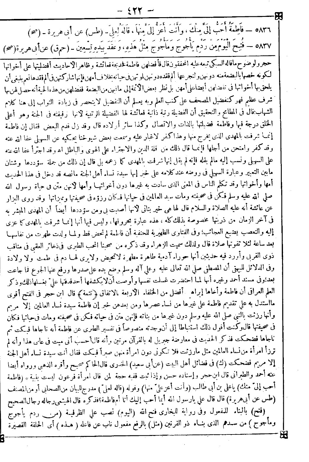 5836 - (فاطمة أحب إلي منك) يا علي بن أبي طالب (وأنت أعز علي منها) وقوله (قاله لعلي) مدرج للبيان من الصحابي أو من المصنف