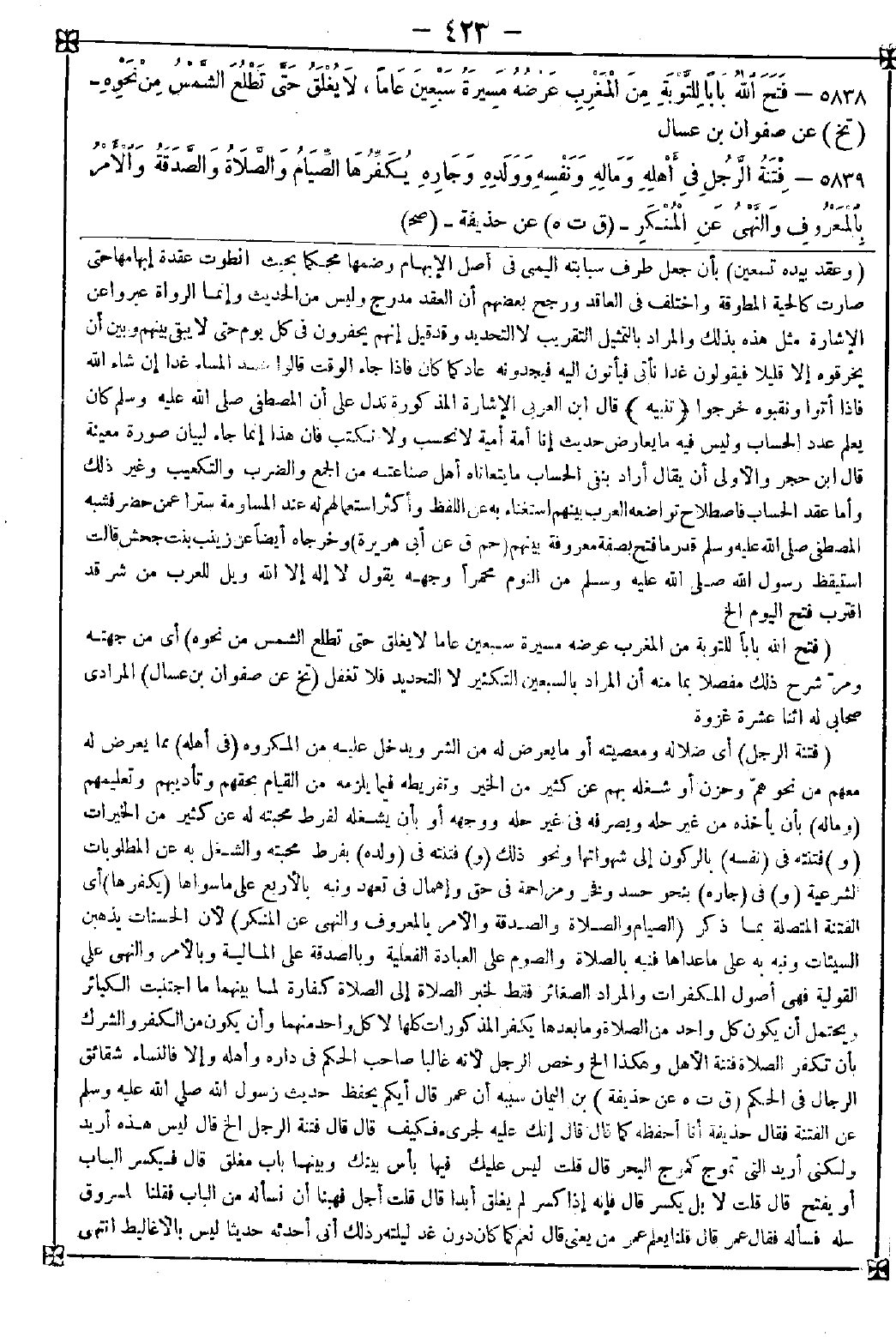 5838 - (فتح الله بابا للتوبة من المغرب عرضه مسيرة سبعين عاما لا يغلق حتى تطلع الشمس من نحوه) أي من جهته ومر شرح ذلك مفصلا بما منه أن المراد بالسبعين التكثير لا التحديد فلا تغفل
