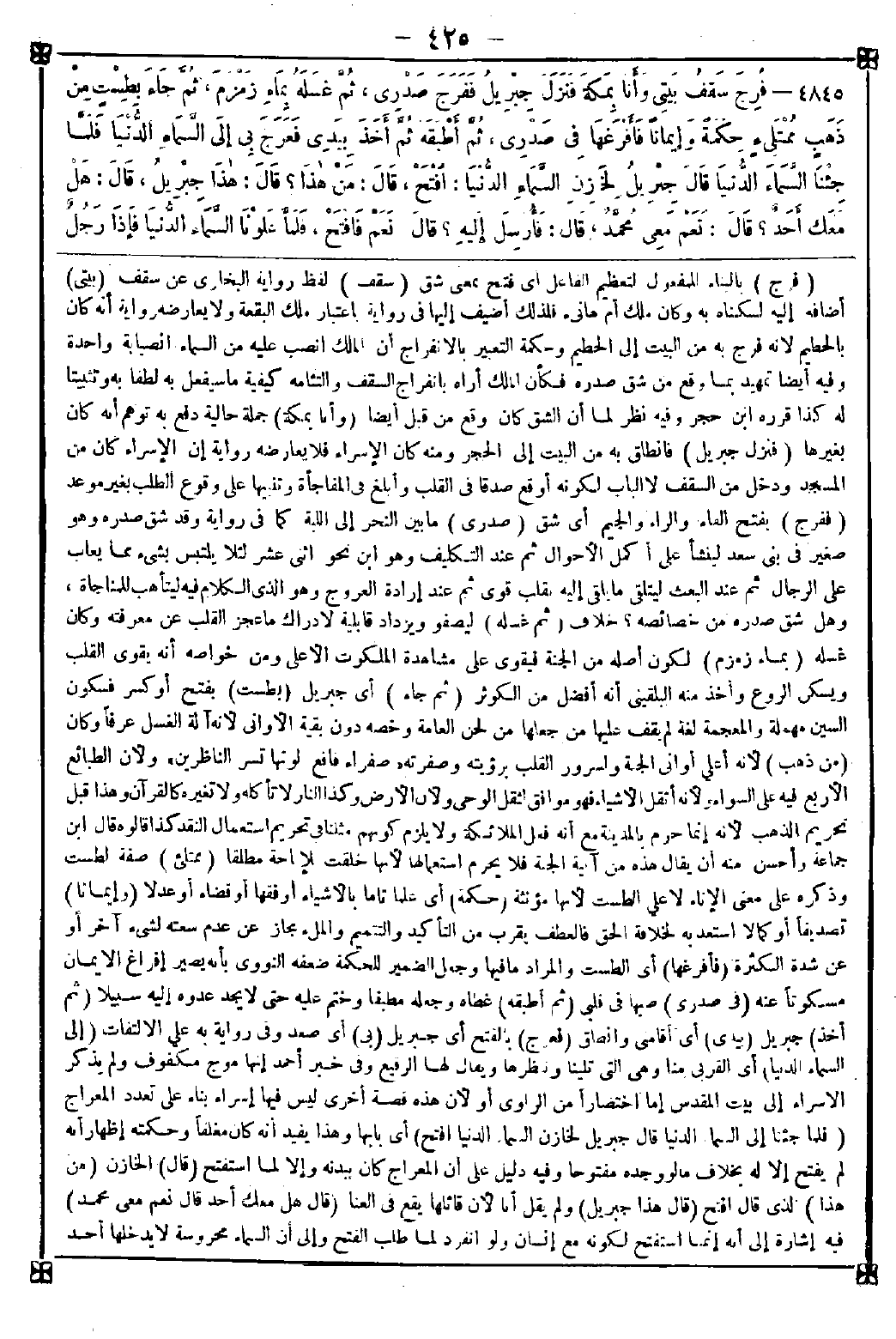 5845 --[425]- (فرج) بالفاء للمفعول لتعظيم الفاعل أي فتح بمعنى شق (سقف) لفظ رواية البخاري عن سقف (بيتي) أضافه إليه لسكناه به وكان ملك أم هانئ فلذلك أضيف إليها في رواية باعتبار ملك البقعة ولا يعارضه رواية أنه كان بالحطيم لأنه فرج به من البيت إلى الحطيم وحكمة التعبير بالانفراج أن الملك انصب عليه من السماء انصبابة واحدة وفيه أيضا تمهيد بما وقع من شق صدره فكأن الملك أراه بانفراج السقف والتئامه كيفية ما سيفعل به لطفا به وتثبيتا له كذا قرره ابن حجر وفيه نظر لما أن الشق كان وقع من قبل أيضا (وأنا بمكة) جملة حالية دفع به توهم أنه كان بغيرها (فنزل جبريل) فانطلق به من البيت إلى الحجر ومنه كان الإسراء فلا يعارضه رواية إن الإسراء كان من المسجد ودخل من السقف لا الباب لكونه أوقع صدقا في القلب وأبلغ في المفاجأة وتنبيها على وقوع الطلب بغير موعد (ففرج) بفتح الفاء والراء والجيم أي شق (صدري) ما بين النحر إلى اللبة كما في رواية وقد شق صدره وهو صغير في بني سعد لينشأ على أكمل الأحوال ثم عند التكليف وهو ابن نحو اثني عشر لئلا يلتبس بشيء مما يعاب على الرجال ثم عند البعث ليتلقى ما يلقى إليه بقلب قوي ثم عند إرادة العروج وهو الذي الكلام فيه ليتأهب للمناجاة وهل شق صدره من خصائصه؟ خلاف (ثم غسله) ليصفو ويزداد قابلية لإدراك ما عجز القلب عن معرفته وكان غسله (بماء زمزم) لكون أصله من الجنة فيقوى على مشاهدة الملكوت الأعلى ومن خواصه أنه يقوي القلب ويسكن الروع وأخذ منه البلقيني أنه أفضل من الكوثر (ثم جاء) أي جبريل (بطست) بفتح أو كسر فسكون السين مهملة والمعجمة لغة لم يقف عليها من جعلها من لحن العامة وخصه دون بقية الأواني لأنه آلة الغسل عرفا وكان (من ذهب) لأنه أعلى أواني الجنة ولسرور القلب برؤيته وصفرته {صفراء فاقع لونها تسر الناظرين} ولأن الطبائع الأربع فيه على السواء ولأنه أثقل الأشياء فهو موافق لثقل الوحي ولأن الأرض وكذا النار لا تأكله ولا تغيره كالقرآن وهذا قبل تحريم الذهب لأنه إنما حرم بالمدينة مع أنه فعل الملائكة ولا يلزم كونهم مثلنا في تحريم استعمال النقد كذا قالوه قال ابن جماعة: وأحسن منه أن يقال هذه من آنية الجنة فلا يحرم استعمالها لأنها خلقت للإباحة مطلقا (ممتلئ) صفة لطست وذكره على معنى الإناء لا على الطست لأنها مؤنثة (حكمة) أي علما تاما بالأشياء أو فقها أو قضاء أو عدلا (وإيمانا) تصديقا أو كمالا استعد به لخلافة الحق فالعطف يقرب من التأكيد والتتميم والملء مجاز عن عدم سعته لشيء آخر أو عن شدة الكثرة (فأفرغها) أي الطست والمراد ما فيها وجعل الضمير للحكمة ضعفه النووي بأنه يصير إفراغ الإيمان مسكوتا عنه (في صدري) صبها في قلبي (ثم أطبقه) غطاه وجعله مطبقا وختم عليه حتى لا يجد عدوه إليه سبيلا (ثم أخذ) جبريل (بيدي) أي أقامني وانطلق (فعرج) بالفتح أي جبريل (بي) أي صعد وفي رواية به على الالتفات (إلى السماء الدنيا) أي القربى منا وهي التي تلينا وننظرها ويقال لها الرفيع وفي خبر أحمد إنها موج مكفوف ولم يذكر الإسراء إلى بيت المقدس إما اختصارا من الراوي أو لأن هذه قصة أخرى ليس فيها إسراء بناء على تعدد المعراج (فلما جئنا إلى السماء الدنيا قال جبريل لخازن السماء الدنيا افتح) أي بابها وهذا يفيد أنه كان مغلقا وحكمته إظهار أنه لم يفتح إلا له بخلاف ما لو وجده مفتوحا وفيه دليل على أن المعراج كان ببدنه وإلا لما استفتح (قال) الخازن (من هذا) الذي قال افتح (قال هذا جبريل) ولم يقل أنا لأن قائلها يقع في العنا (قال هل معك أحد قال نعم معي محمد) فيه إشارة إلى أنه إنما استفتح لكونه مع إنسان ولو انفرد لما طلب الفتح وإلى أن السماء محروسة لا يدخلها أحد