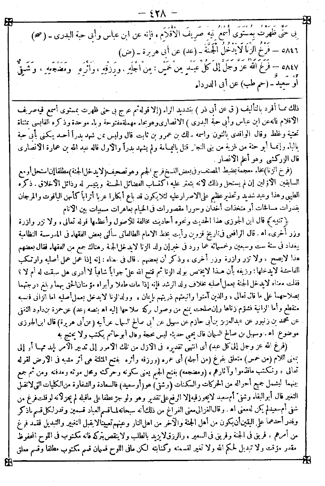 5847 - (فرغ الله عز وجل إلى كل عبد) أي انتهى تقديره في الأزل من تلك الأمور إلى تدبير الأمر بإبدائها أو إلى بمعنى اللام (من خمس) متعلق بفرغ (من أجله) أي عمره (ورزقه وأثره) بفتح المثلثة هي أثر مشيه في الأرض لقوله تعالى {ونكتب ما قدموا وآثارهم} (ومضجعه) بفتح الجيم يعني سكونه وحركته ومحل موته ومدفنه ومن ثم جمع بينهما ليشمل جميع أحواله من الحركات والسكنات (وشقي) هو (أو سعيد) فالسعادة أو الشقاوة من الكليات التي لا تقبل التغيير قال أبو البقاء: وشقي أم سعيد لا يجوز فيه إلا الرفع على تقدير وهو ولو جر عطفا على ما قبله لم يجز لأنه لو قلت فرغ من شقي أم سعيد لم يكن له معنى اه. وقال الغزالي: معنى الفراغ من ذلك أنه سبحانه لما قسم العباد قسمين وقدر لكل قسم ما ذكر وقدر أحدهما على اليقين أن يكون من أهل الجنة والآخر من أهل النار وعينهم تعيينا لا يقبل التغيير والتبديل فقد فرغ من أمرهم {فريق في الجنة وفريق في السعير} والرزق لا يزيد بالطلب ولا ينقص بتركه فإنه مكتوب في اللوح المحفوظ مقدر مؤقت ولا تبديل لحكم الله ولا تغير لقسمته وكتابته لكن ما في اللوح قسمان قسم مكتوب مطلقا وقسم معلق -[429]- بفعل العبد (تتمة) قال ابن عطاء الله: سوابق الهمم لا تخرق أسوار الأقدار أرح نفسك من التدبير فما قام به غيرك عنك لا تقم به لنفسك