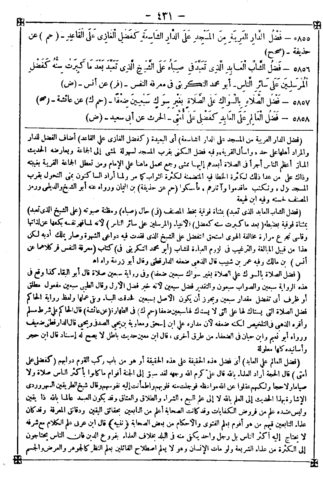 5858 - (فضل العالم على العابد) أي فضل هذه الحقيقة على هذه الحقيقة أو هو من باب ركب القوم دوابهم (كفضلي على أمتي) قال الحجة: أراد العلماء بالله قال علي كرم الله وجهه: لقد سبق إلى الجنة أقوام ما كانوا بأكثر الناس صلاة ولا صياما ولا حجا ولكنهم عقلوا عن الله مواعظه فوجلت منه قلوبهم واطمأنت إليه نفوسهم وقال شيخ الطريقين السهروردي: الإشارة بهذا الحديث إلى العلم بالله لا إلى علم البيع والشراء والطلاق والعتاق وقد يكون العبد عالما بالله ذا يقين وليس عنده علم من فروض الكفايات وقد كانت الصحابة أعلم من التابعين بحقائق اليقين ودقائق المعرفة وقد كان علماء التابعين فيهم من هو أقوم بعلم الفتوى والأحكام من بعض الصحابة <تنبيه> قال ابن عربي: علم الكلام مع شرفه لا يحتاج إليه أكثر الناس بل رجل واحد يكفي منه في البلد بخلاف العلماء بفروع الدين فإن الناس يحتاجون إلى الكثرة من علماء الشريعة ولو مات الإنسان وهو لا يعلم اصطلاح القائلين بعلم النظر كالجوهر والعرض والجسم -[432]- والجسماني والروح والروحاني لم يسأله الله عن ذلك فإنما يسأل الناس عما وجب عليهم من التكليف بالفروع ونحوها