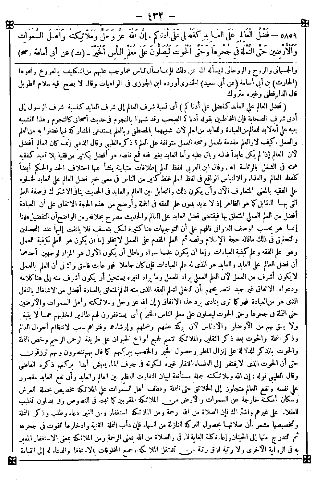 5859 - (فضل العالم على العابد كفضلي على أدناكم) أي نسبة شرف العالم إلى شرف العابد كنسبة شرف الرسول إلى أدنى شرف الصحابة فإن المخاطبين بقوله أدناكم الصحب وقد شبهوا بالنجوم في حديث أصحابي كالنجوم وهذا التشبيه ينبه على أنه لا بد للعالم من العبادة وللعابد من العلم لأن تشبيههما بالمصطفى وبالعلم يستدعي المشاركة فيما فضلوا به من العلم والعمل كيف لا والعلم مقدمة للعمل وصحة العمل متوقفة على العلم؟ ذكره الطيبي. وقال الذهبي: إنما كان العالم أفضل لأن العالم إذا لم يكن عابدا فعلمه وبال عليه وأما العابد بغير فقه فمع نقصه هو أفضل بكثير من فقيه بلا تعبد كفقيه همته في الشغل بالرئاسة اه. وقال ابن العربي: للفظ العلم إطلاقات متباينة ينشأ عنها اختلاف الحد والحكم أيضا كلفظ العالم والعلماء وللالتباس الواقع في لفظ العلم غلط كثير من الناس في معنى خبر فضل العالم على العابد فحملوه على الفقيه بالمعنى المتعارف الآن وأن يكون ذلك والتقابل بين العالم والعابد في الحديث ينافي الاشتراك في صفة العلم التي بها التقابل كما هو الظاهر إذ لا عابد بدون علم الفقه في الجملة وأوضح من هذه الحجة الاتفاق على أن العبادة أفضل من العلم العملي المتعلق بها فيقتضي فضل العابد على العالم والحديث مصرح بخلافه ومن الواضح أن التفضيل ههنا إنما هو بحسب الوصف العنواني فافهم. على أن التوجيهات قليلة هنا كثيرة لكن بتعسف فلا يلتفت إليها عند المحصلين والتحقيق في ذلك ما قاله حجة الإسلام ونصه ثم العلم المقدم على العمل لا يخلو إما أن يكون هو العلم بكيفية العمل وهو علم الفقه وعلم كيفية العبادات وإما أن يكون علما سواه وباطل أن يكون الأول هو المراد لوجهين أحدهما أن فضل العالم على العابد والعابد هو الذي له علم العبادات فإن كان جاهلا فهو عابث فاسق والثاني أن العلم بالعمل لا يكون أشرف من العمل لأن العلم العملي يراد للعمل وما يراد لغيره يستحيل أن يكون أشرف منه إلى هنا كلامه ودعواه الاتفاق غير جيد لتصريحهم بأن التخلي لتعلم الفقه الذي منه العلم المتعلق بالعبادة أفضل من الاشتغال بالنفل الذي هو من العبادة فهو كما ترى ينادي برد هذا الاتفاق (إن الله عز وجل وملائكته وأهل السماوات والأرضين حتى النملة في جحرها وحتى الحوت ليصلون على معلم الناس الخير) أي يستغفرون لهم طالبين لتخليهم عما لا ينبغي ولا يبق بهم من الأوضار والأدناس لأن بركة علمهم وعملهم وإرشادهم وفتواهم سبب لانتظام أحوال العالم وذكر النملة والحوت بعد ذكر الثقلين والملائكة تتميم لجميع أنواع الحيوان على طريقة الرحمن الرحيم وخص النملة والحوت بالذكر للدلالة على إنزال المطر وحصول الخير والخصب ببركتهم كما قال بهم تنصرون وبهم ترزقون حتى أن الحوت الذي لا يفتقر إلى العلماء افتقار غيره لكونه في جوف الماء يعيش أبدا ببركتهم ذكره القاضي وقال الطيبي: قوله إن الله وملائكته جملة مستأنفة لبيان التفاوت العظيم بين العالم والعابد وأن نفع العابد مقصور على نفسه ونفع العالم متجاوز إلى الخلائق حتى النملة وعطف أهل السماوات على الملائكة تخصيص بحملة العرش وسكان أمكنة خارجة عن السماوات والأرض من الملائكة المقربين كما ثبت في النصوص وفي يصلون تغليب للعقلاء على غيرهم واشتراك فإن الصلاة من الله رحمة ومن الملائكة استغفار ومن الغير دعاء وطلب وذكر النملة وتخصيصها مشعر بأن صلاتها بحصول البركة النازلة من السماء فإن دأب النملة القنية وادخارها القوت في جحرها ثم التدرج منها إلى الحيتان وإعادة كلمة الغاية للترقي والصلاة من الله بمعنى الرحمة ومن الملائكة بمعنى الاستغفار المعبر به في الرواية الأخرى ولا رتبة فوق رتبة من تشتغل الملائكة وجميع المخلوقات بالاستغفار والدعاء له إلى القيامة -[433]- ولهذا كان ثوابه لا ينقطع بموته وأنه ليتنافس في دعوة رجل صالح فكيف بدعاء الملأ الأعلى وأما إلهام الحيوانات الاستغفار له فقيل لأنها خلقت لمصالح العباد ومنافعهم والعلماء هم المبينون ما يحل منها وما يحرم ويوصون بالإحسان إليها ودفع ا