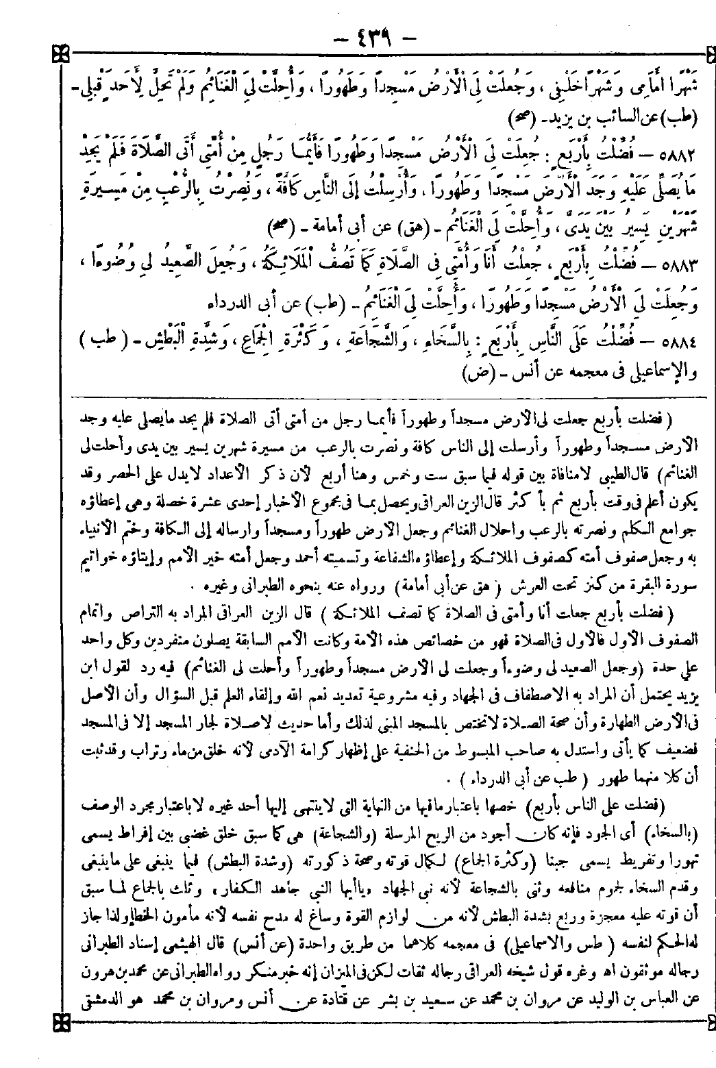 -[439]- 5882 - (فضلت بأربع جعلت لي الأرض مسجدا وطهورا فأيما رجل من أمتي أتى الصلاة فلم يجد ما يصلي عليه وجد الأرض مسجدا وطهورا وأرسلت إلى الناس كافة ونصرت بالرعب من مسيرة شهرين يسير بين يدي وأحلت لي الغنائم) قال الطيبي: لا منافاة بين فيما سبق ست وخمس وهنا أربع لأن ذكر الأعداد لا يدل على الحصر وقد يكون أعلم في وقت بأربع ثم بأكثر قال الزين العراقي: ويحصل بما في مجموع الأخبار إحدى عشرة خصلة وهي إعطاؤه جوامع الكلم ونصرته بالرعب وإحلال الغنائم وجعل الأرض طهورا ومسجدا وإرساله إلى الكافة وختم الأنبياء به وجعل صفوف أمته كصفوف الملائكة وإعطاؤه الشفاعة وتسميته أحمد وجعل أمته خير الأمم وإيتاؤه خواتيم سورة البقرة من كنز تحت العرش