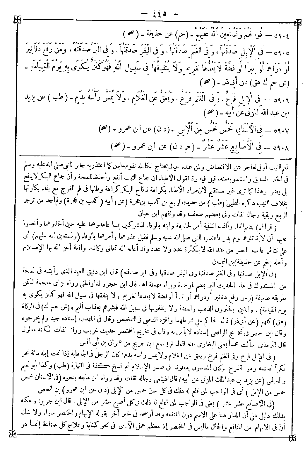 5905 - (في الإبل صدقتها وفي الغنم صدقتها وفي البر صدقته) قال ابن دقيق العيد: الذي رأيته في نسخة من المستدرك في هذا الحديث البر بضم الموحدة وبراء مهملة اه. قال ابن حجر: والدارقطني رواه بزاي معجمة لكن طريقه ضعيفة (ومن رفع دنانير أو دراهم أو تبرا أو فضة لا يعدها لغريم ولا ينفقها في سبيل الله فهو كنز يكوى به يوم القيامة) {والذين يكنزون الذهب والفضة ولا ينفقونها في سبيل الله فبشرهم بعذاب أليم}