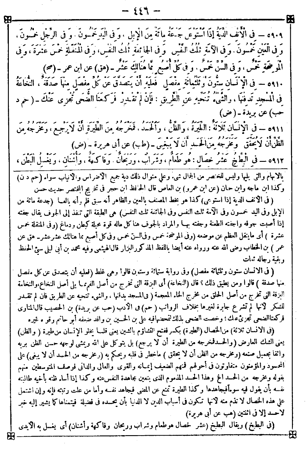 5910 - (في الإنسان ستون وثلاث مئة مفصل) وفي رواية ست مئة وستون قالوا: وهي غلط (فعليه أن يتصدق عن كل مفصل منها صدقة) قالوا: ومن يطيق ذلك؟ قال: (النخاعة) أي البزقة التي تخرج من أصل الفم مما يلي أصل النخاع والنخامة البزقة التي تخرج من أصل الحلق من مخرج الخاء المعجمة (في المسجد يدفنها والشيء تنحيه عن الطريق فإن لم تقدر) للشكر لأنها لم تشرع جابرة لغيرها بخلاف الرواتب (فركعتا الضحى تجزئ عنك) وخصت الضحى بذلك لتمحضها