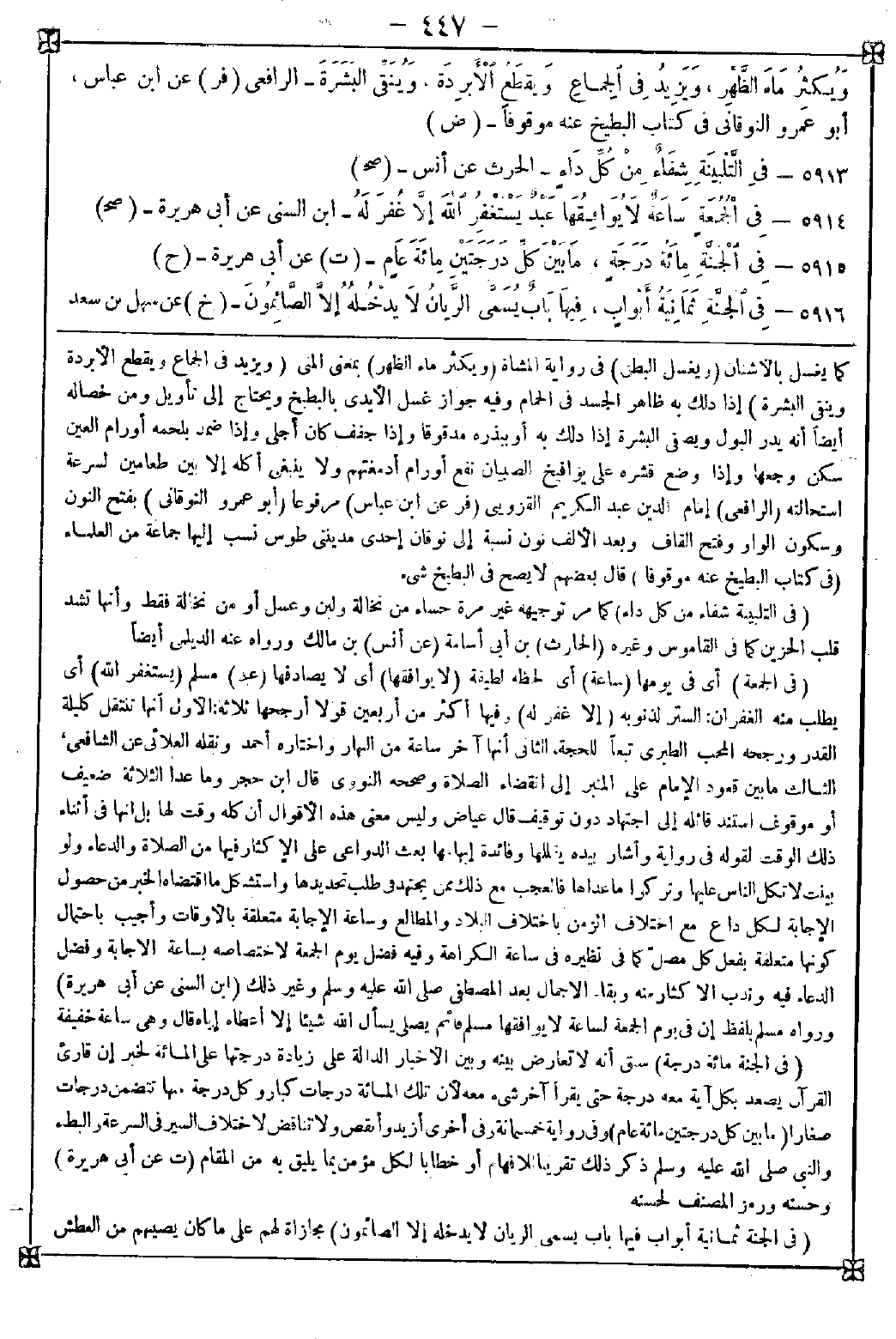 5914 - (في الجمعة) أي في يومها (ساعة) أي لحظة لطيفة (لا يوافقها) أي لا يصادفها (عبد) مسلم (يستغفر الله) أي يطلب منه الغفران: الستر لذنوبه (إلا غفر له) وفيها أكثر من أربعين قولا أرجحها ثلاثة: الأول أنها تنتقل كليلة القدر ورجحه المحب الطبري تبعا للحجة الثاني أنها آخر ساعة من النهار واختاره أحمد ونقله العلائي عن الشافعي الثالث ما بين قعود الإمام على المنبر إلى انقضاء الصلاة وصححه النووي قال ابن حجر: وما عدا الثلاثة ضعيف أو موقوف استند قائله إلى اجتهاد دون توقيف قال عياض: وليس معنى هذه الأقوال أن كله وقت لها بل أنها في أثناء ذلك الوقت لقوله في رواية وأشار بيده يقللها وفائدة إبهامها بعث الدواعي على الإكثار فيها من الصلاة والدعاء ولو بينت لاتكل الناس عليها وتركوا ما عداها فالعجب مع ذلك ممن يجتهد في طلب تحديدها واستشكل ما اقتضاه الخبر من حصول الإجابة لكل داع مع اختلاف الزمن باختلاف البلاد والمطالع وساعة الإجابة متعلقة بالأوقات وأجيب باحتمال كونها متعلقة بفعل كل مصل كما في نظيره في ساعة الكراهة وفيه فضل يوم الجمعة لاختصاصه بساعة الإجابة وفضل الدعاء فيه وندب الإكثار منه وبقاء الإجمال بعد المصطفى صلى الله عليه وسلم وغير ذلك