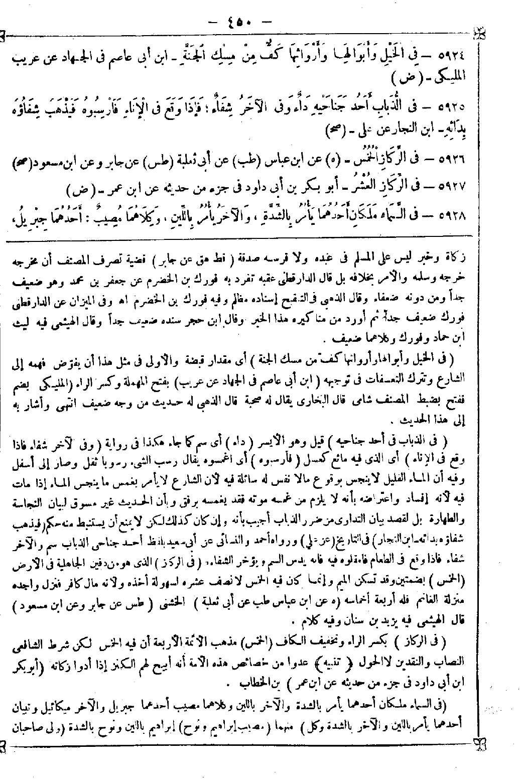 5924 - (في الخيل وأبوالها وأرواثها كف من مسك الجنة) أي مقدار قبضة والأولى في مثل هذا أن يفوض فهمه إلى الشارع وتترك التعسفات في توجيهه