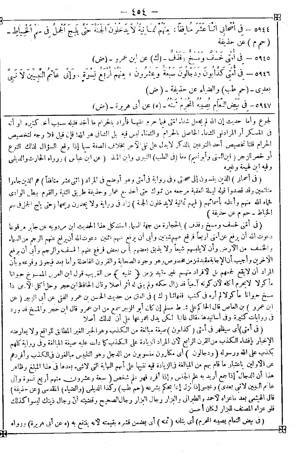 5945 - (في أمتي خسف ومسخ وقذف) بالحجارة من جهة السماء استشكل هذا الحديث ابن مردويه عن جابر مرفوعا دعوت الله أن يرفع عن أمتي أربعا فرفع عنهم شيئين وأبى أن يرفع عنهم اثنين دعوت الله أن يرفع عنهم الرجم من السماء والخسف من الأرض وأن لا يلبسهم شيعا ولا يذيق بعضهم بأس بعض فرفع عنهم الخسف والرجم وأبى أن يرفع الآخرين وأجيب أن الإجابة مقيدة بزمن مخصوص وهو وجود الصحابة والقرون الفاضلة وأما بعد فيجوز وقوعه وبأن المراد أن لا يقع لجمعهم بل لأفراد منهم غير مقيد بزمن <تنبيه> من الغريب قول ابن العربي الممسوخ حيوانا مأكولا لا يحرم أكله لأن كونه آدميا قد زال حكمه ولم يبق له أثر أصلا وقال الحافظ ابن حجر: وحل أكل الآدمي إذا مسخ حيوانا مأكولا لم أره في كتب فقهائنا