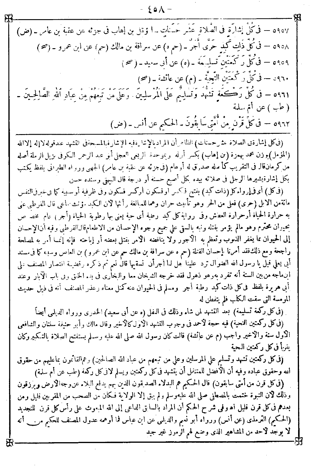 -[458]- 5957 - (في كل إشارة في الصلاة عشر حسنات) الظاهر أن المراد بالإشارة فيه الإشارة بالمسبحة في التشهد عند قوله لا إله إلا الله
