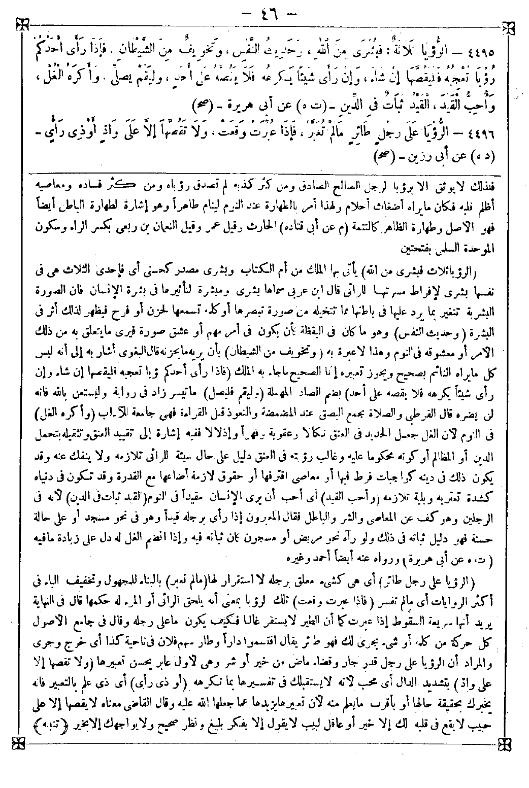 4495 - (الرؤيا ثلاث فبشرى من الله) يأتي بها الملك من أم الكتاب وبشرى مصدر كحسنى أي فإحدى الثلاث هي في نفسها بشرى لإفراط مسرتها للرائي قال ابن عربي: سماها بشرى ومبشرة لتأثيرها في بشرة الإنسان فإن الصورة البشرية تتغير بما يرد عليها في باطنها مما تتخيله من صورة تبصرها أو كلمة تسمعها لحزن أو فرح فيظهر لذلك أثر في البشرة (وحديث النفس) وهو ما كان في اليقظة كأن يكون في أمر مهم أو عشق صورة فيرى ما يتعلق به من ذلك الأمر أو معشوقه في النوم وهذا لا عبرة به (وتخويف من الشيطان) بأن يريه ما يحزنه قال البغوي: أشار به إلى أنه ليس كل ما يراه النائم بصحيح ويجوز تعبيره إنما الصحيح ما جاء به الملك (فإذا رأى أحدكم رؤيا تعجبه فليقصها إن شاء وإن رأى شيئا يكرهه فلا يقصه على أحد) بضم الصاد المهملة (وليقم فليصل) ما تيسر زاد في رواية وليستعن بالله فإنه لن يضره قال القرطبي: والصلاة بجمع البصق عند المضمضة والتعوذ قبل القراءة فهي جامعة للآداب (وأكره الغل) في النوم لأن الغل جعل الحديد في النوم نكالا وعقوبة وقهرا وإذلالا ففيه إشارة إلى تقييد العنق وتثقيله بتحمل الدين أو المظالم أو كونه محكوما عليه وغالب رؤيته في العنق دليل على حال سيئة للرائي تلازمه ولا تنفك عنه وقد يكون ذلك في دينه كواجبات فرط فيها أو معاصي اقترفها أو حقوق لازمة أضاعها مع القدرة وقد تكون في دنياه كشدة تعتريه وبلية تلازمه (وأحب القيد) أي أحب أن يرى الإنسان مقيدا في النوم (القيد ثبات في الدين) لأنه في الرجلين وهو كف عن المعاصي والشر والباطل فقال المعبرون: إذا رأى برجله قيدا وهو في نحو مسجد أو على حالة حسنة فهو دليل ثباته في ذلك ولو رآه نحو مريض أو مسجون كان ثباته فيه وإذا انضم الغل له دل على زيادة ما فيه