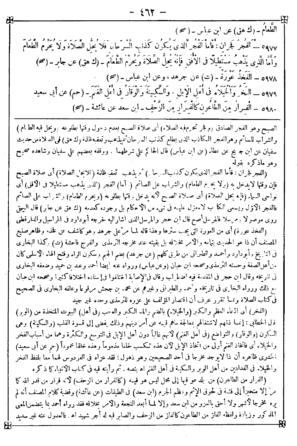 5977 - (الفجر فجران: فأما الفجر الذي يكون كذنب السرحان) ثم يذهب تعقبه ظلمة (فلا يحل الصلاة) أي صلاة الصبح أي وقتها لا يدخل به (ولا يحرم الطعام) والشراب على الصائم (وأما) الفجر (الذي يذهب مستطيلا في الأفق) أي نواحي السماء (فإنه يحل الصلاة) أي صلاة الصبح لأنه يدخل وقتها بطلوعه (ويحرم الطعام) والشراب على الصائم فالفجر الأول ويسمى الكاذب لا معول عليه في شيء من الأحكام بل وجوده كعدمه