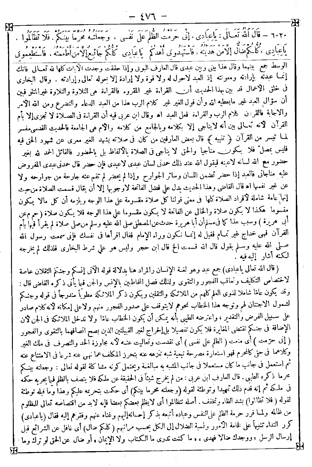 6020 - (قال الله تعالى يا عبادي) جمع عبد وهو لغة الإنسان والمراد هنا بدلالة قوله الآتي إنسكم وجنكم الثقلان خاصة لاختصاص التكليف وتعاقب الفجور والتقوى ولذلك فصل المخاطبين بالإنس والجن فيما يأتي ذكره القاضي قال: وقد يكون عاما شاملا لذوي العلم كلهم من الملائكة والثقلين ويكون ذكر الملائكة مطويا مندرجا في قوله وجنكم لشمول الاجتنان لهم وتوجه هذا الخطاب نحوهم لا يتوقف على صدور الفجور منهم ولا على إمكانه لأنه كلام صادر على سبيل الفرض والتقدير واعترضه الطيبي بأنه يمكن أن يكون الخطاب عاما ولا تدخل الملائكة في الجن لأن الإضافة في جنكم تقتضي المغايرة فلا يكون تفصيلا بل إخراج لغير القبيلتين الذين يصح اتصافهما بالتقوى والفجور (إني حرمت) أي منعت (الظلم على نفسي) أي تقدست وتعاليت عنه لأنه مجاوزة والتصرف في ملك الغير وكلاهما في حقي كالمحرم فهو استعارة مصرحة تبعية شبه تنزهه عنه بتحرز المكلف عما نهى عنه شرعا في الامتناع عنه ثم استعمل في جانب ما كان مستعملا في جانب المشبه به مبالغة ويحتمل كونه مشاكلة لقوله تعالى: وجعلته بينكم محرما ذكره الطيبي. قال العارف ابن عربي: من لم يخرج شيئا في الحقيقة عن ملكه فلا يتصف بالظلم فيما يجريه حكمه في ملكه ثم إنه قدم ذلك تمهيدا وتوطئة لقوله (وجعلته محرما بينكم) أي حكمت بتحريمه عليكم وهذا وما قبله توطئة لقوله (فلا تظالموا) بشد الظاء وتخفف. أصله تتظالموا أي لا يظلم بعضكم بعضا فإنه لا بد من اقتصاصه تعالى للمظلوم من ظالمه ولما قرر حرمة الظلم على النفس وعباده أتبعه بذكر إحسانه إليهم وغناه عنهم وفقرهم إليه فقال (يا عبادي) كرر النداء تنبيها على فخامة الأمور ونسبة الضلال إلى الكل بحسب مراتبهم (كلكم ضال) أي غافل عن الشرائع قبل إرسال الرسل {ووجدك ضالا فهدى} {ما كنت تدري ما الكتاب ولا الإيمان} أو ضال عن الحق لو ترك وما